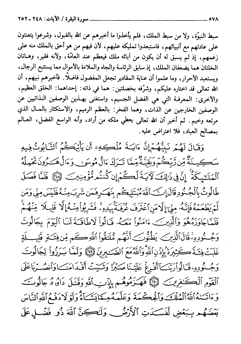 وَقالَ لَهُمْ نَبِيُّهُمْ إِنَّ آيَةَ مُلْكِهِ أَنْ يَأْتِيَكُمُ التَّابُوتُ فِيهِ سَكِينَةٌ مِنْ رَبِّكُمْ وَبَقِيَّةٌ مِمَّا تَرَكَ آلُ مُوسى وَآلُ هارُونَ تَحْمِلُهُ الْمَلائِكَةُ إِنَّ فِي ذلِكَ لَآيَةً لَكُمْ إِنْ كُنْتُمْ مُؤْمِنِينَ (248) فَلَمَّا فَصَلَ طالُوتُ بِالْجُنُودِ قالَ إِنَّ اللَّهَ مُبْتَلِيكُمْ بِنَهَرٍ فَمَنْ شَرِبَ مِنْهُ فَلَيْسَ مِنِّي وَمَنْ لَمْ يَطْعَمْهُ فَإِنَّهُ مِنِّي إِلاَّ مَنِ اغْتَرَفَ غُرْفَةً بِيَدِهِ فَشَرِبُوا مِنْهُ إِلاَّ قَلِيلاً مِنْهُمْ فَلَمَّا جاوَزَهُ هُوَ وَالَّذِينَ آمَنُوا مَعَهُ قالُوا لَا طاقَةَ لَنَا الْيَوْمَ بِجالُوتَ وَجُنُودِهِ قالَ الَّذِينَ يَظُنُّونَ أَنَّهُمْ مُلاقُوا اللَّهِ كَمْ مِنْ فِئَةٍ قَلِيلَةٍ غَلَبَتْ فِئَةً كَثِيرَةً بِإِذْنِ اللَّهِ وَاللَّهُ مَعَ الصَّابِرِينَ (249) وَلَمَّا بَرَزُوا لِجالُوتَ وَجُنُودِهِ قالُوا رَبَّنا أَفْرِغْ عَلَيْنا صَبْراً وَثَبِّتْ أَقْدامَنا وَانْصُرْنا عَلَى الْقَوْمِ الْكافِرِينَ (250) فَهَزَمُوهُمْ بِإِذْنِ اللَّهِ وَقَتَلَ داوُدُ جالُوتَ وَآتاهُ اللَّهُ الْمُلْكَ وَالْحِكْمَةَ وَعَلَّمَهُ مِمَّا يَشاءُ وَلَوْلا دَفْعُ اللَّهِ النَّاسَ بَعْضَهُمْ بِبَعْضٍ لَفَسَدَتِ الْأَرْضُ وَلكِنَّ اللَّهَ ذُو فَضْلٍ عَلَى الْعالَمِينَ (251) تِلْكَ آياتُ اللَّهِ نَتْلُوها عَلَيْكَ بِالْحَقِّ وَإِنَّكَ لَمِنَ الْمُرْسَلِينَ (252)