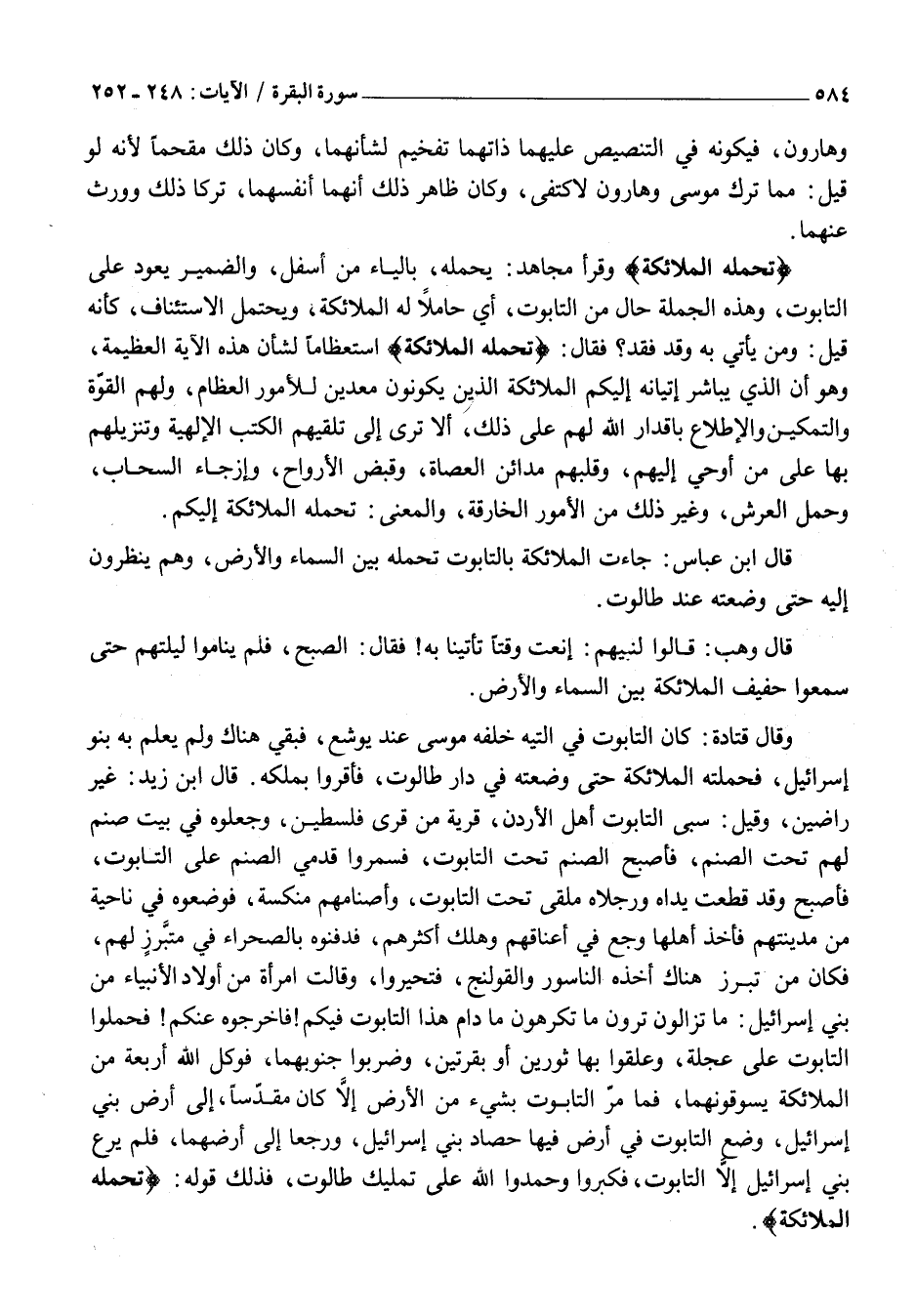 وَقَالَ قَتَادَةُ: كَانَ التَّابُوتُ فِي التِّيهِ خَلَّفَهُ مُوسَى عِنْدَ يُوشَعَ، فَبَقِيَ هُنَاكَ وَلَمْ يَعْلَمْ بِهِ بَنُو إِسْرَائِيلَ، فَحَمَلَتْهُ الْمَلَائِكَةُ حَتَّى وَضَعَتْهُ فِي دَارِ طَالُوتَ، فَأَقَرُّوا بِمُلْكِهِ. قَالَ ابْنُ زَيْدٍ: غَيْرَ رَاضِينَ، وَقِيلَ: سَبَى التَّابُوتَ أَهْلُ الْأُرْدُنِّ، قَرْيَةٌ مِنْ قُرَى فِلَسْطِينَ، وَجَعَلُوهُ فِي بَيْتِ صَنَمٍ لَهُمْ تَحْتَ الصَّنَمِ، فَأَصْبَحَ الصَّنَمُ تَحْتَ التَّابُوتِ، فَسَمَّرُوا قَدَمَيِ الصَّنَمِ عَلَى التَّابُوتِ، فَأَصْبَحَ وَقَدْ قُطِعَتْ يَدَاهُ وَرِجْلَاهُ مُلْقًى تَحْتَ التَّابُوتِ، وَأَصْنَامُهُمْ مُنَكَّسَةٌ، فَوَضَعُوهُ فِي نَاحِيَةٍ مِنْ مَدِينَتِهِمْ فَأَخَذَ أَهْلُهَا وَجَعٌ فِي أَعْنَاقِهِمْ وَهَلَكَ أَكْثَرُهُمْ، فَدَفَنُوهُ بِالصَّحْرَاءِ فِي مُتَبَرَّزٍ لَهُمْ، فَكَانَ مَنْ تَبَرَّزَ هُنَاكَ أَخَذَهُ النَّاسُورُ وَالْقُولَنْجُ، فَتَحَيَّرُوا، وَقَالَتِ امْرَأَةٌ مِنْ أَوْلَادِ الْأَنْبِيَاءِ مِنْ بَنِي إِسْرَائِيلَ: ما تزالون تَرَوْنَ مَا تَكْرَهُونَ مَا دَامَ هَذَا التَّابُوتُ فِيكُمْ! فَأَخْرِجُوهُ عَنْكُمْ! فَحَمَلُوا التَّابُوتَ عَلَى عَجَلَةٍ، وَعَلَّقُوا بِهَا ثَوْرَيْنِ أَوْ بَقَرَتَيْنِ، وَضَرَبُوا جَنُوبَهُمَا، فَوَكَّلَ اللَّهُ أَرْبَعَةً مِنَ الْمَلَائِكَةِ يَسُوقُونَهُمَا، فَمَا مَرَّ التَّابُوتُ بِشَيْءٍ مِنَ الْأَرْضِ إِلَّا كَانَ مُقَدَّسًا، إِلَى أَرْضِ بَنِي إِسْرَائِيلَ، وُضِعَ التَّابُوتُ فِي أَرْضٍ فِيهَا حَصَادُ بَنِي إِسْرَائِيلَ، وَرَجَعَا إِلَى أَرْضِهِمَا، فَلَمْ يَرْعَ بَنِي إِسْرَائِيلَ إِلَّا التَّابُوتُ، فَكَبَّرُوا وَحَمِدُوا اللَّهَ عَلَى تَمْلِيكِ طَالُوتَ، فَذَلِكَ قَوْلُهُ: تَحْمِلُهُ الْمَلائِكَةُ.