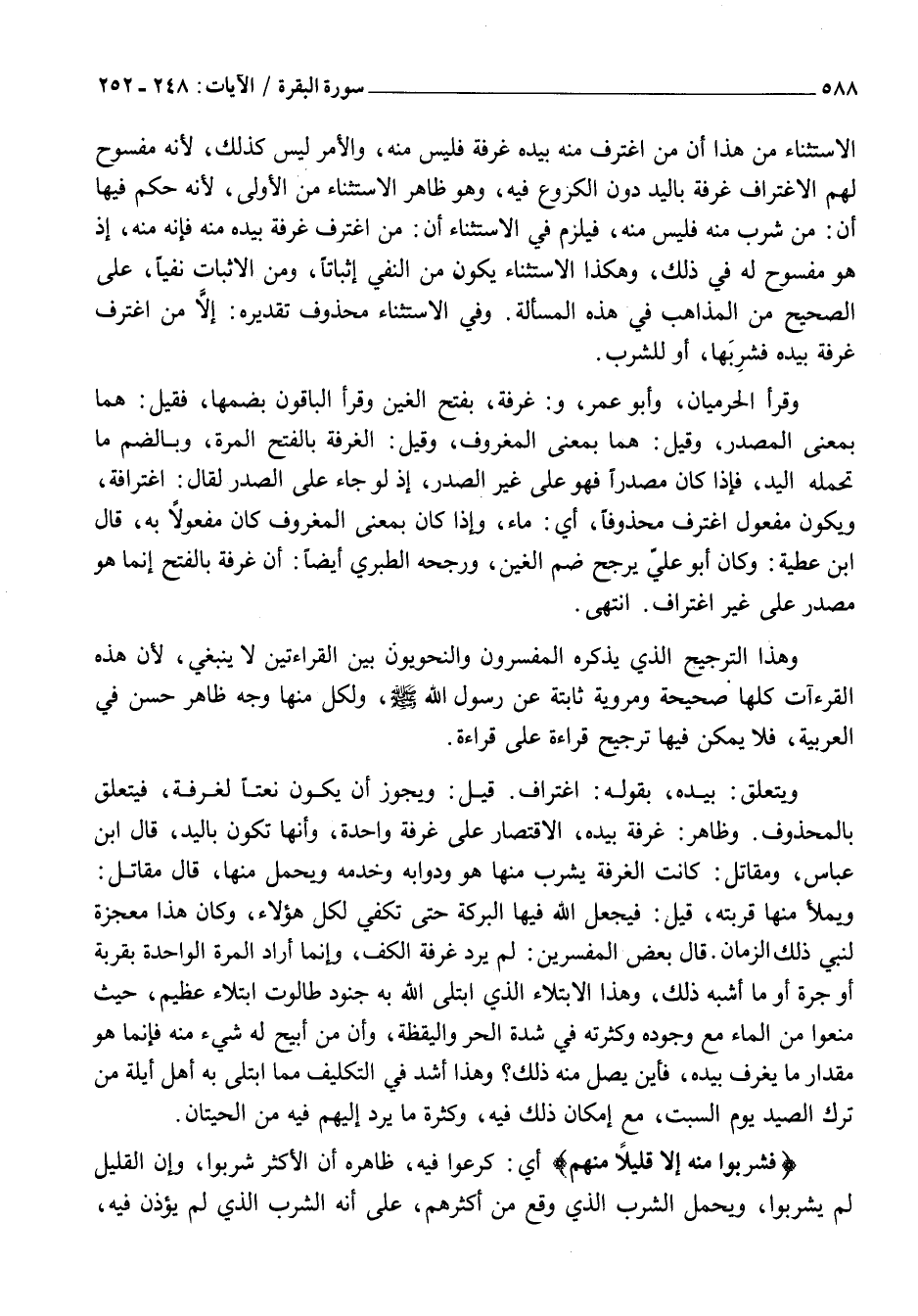 الِاسْتِثْنَاءِ مِنْ هَذَا أَنَّ مَنِ اغْتَرَفَ مِنْهُ بِيَدِهِ غُرْفَةً فَلَيْسَ مِنْهُ، وَالْأَمْرُ لَيْسَ كَذَلِكَ، لِأَنَّهُ مَفْسُوحٌ لَهُمُ الِاغْتِرَافُ غُرْفَةً بِالْيَدِ دُونَ الْكُرُوعِ فِيهِ، وَهُوَ ظَاهِرُ الِاسْتِثْنَاءِ مِنَ الْأُولَى، لِأَنَّهُ حَكَمَ فِيهَا أَنَّ: مَنْ شَرِبَ مِنْهُ فَلَيْسَ مِنْهُ، فَيَلْزَمُ فِي الِاسْتِثْنَاءِ أَنَّ: مَنِ اغْتَرَفَ غُرْفَةً بِيَدِهِ مِنْهُ فَإِنَّهُ مِنْهُ، إِذْ هُوَ مَفْسُوحٌ لَهُ فِي ذَلِكَ، وَهَكَذَا الِاسْتِثْنَاءُ يَكُونُ مِنَ النَّفْيِ إِثْبَاتًا، وَمِنَ الْإِثْبَاتِ نَفْيًا، عَلَى الصَّحِيحِ مِنَ الْمَذَاهِبِ فِي هَذِهِ الْمَسْأَلَةِ. وَفِي الِاسْتِثْنَاءِ مَحْذُوفٌ تَقْدِيرُهُ: إِلَّا مَنِ اغْتَرَفَ غُرْفَةً بِيَدِهِ فَشَرِبَهَا، أَوْ لِلشُّرْبِ.