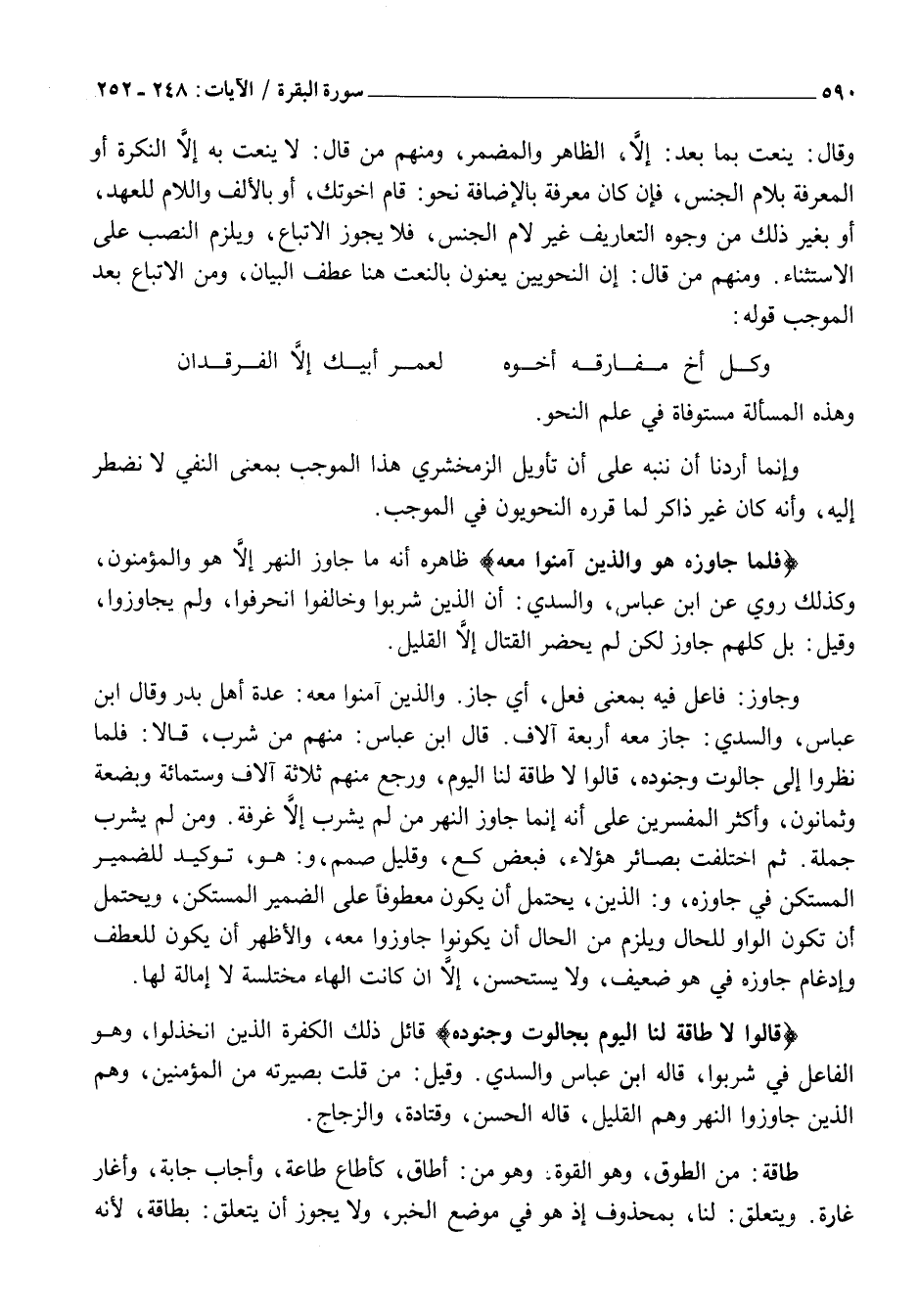 وَجَاوَزَ: فَاعِلٌ فِيهِ بِمَعْنَى فَعَلَ، أَيْ جَازَ. وَالَّذِينَ آمَنُوا مَعَهُ: عِدَّةُ أَهْلِ بَدْرٍ وَقَالَ ابْنُ عَبَّاسٍ، وَالسُّدِّيُّ: جَازَ مَعَهُ أَرْبَعَةُ آلَافٍ. قَالَ ابْنُ عَبَّاسٍ: مِنْهُمْ مَنْ شَرِبَ، قَالَا: فَلَمَّا نَظَرُوا إِلَى جَالُوتَ وَجُنُودِهِ، قَالُوا لَا طَاقَةَ لَنَا الْيَوْمَ، وَرَجَعَ مِنْهُمْ ثَلَاثَةُ آلَافٍ وَسِتُّمِائَةٍ وَبِضْعَةٌ وَثَمَانُونَ، وَأَكْثَرُ الْمُفَسِّرِينَ عَلَى أَنَّهُ إِنَّمَا جَاوَزَ النَّهَرَ مَنْ لَمْ يَشْرَبْ إِلَّا غُرْفَةً. وَمَنْ لَمْ يَشْرَبْ جُمْلَةً. ثُمَّ اخْتَلَفَتْ بَصَائِرُ هَؤُلَاءِ، فَبَعْضٌ كَعَّ، وَقَلِيلٌ صَمَّمَ، وَ: هُوَ، تَوْكِيدٌ لِلضَّمِيرِ الْمَسْتَكِنِّ فِي جاوزه، وَ: الَّذِينَ، يُحْتَمَلُ أَنْ يَكُونَ مَعْطُوفًا عَلَى الضَّمِيرِ الْمُسْتَكِنِ، وَيُحْتَمَلُ أَنْ تَكُونَ الْوَاوُ لِلْحَالِ وَيَلْزَمُ مِنَ الْحَالِ أَنْ يَكُونُوا جَاوَزُوا مَعَهُ، وَالْأَظْهَرُ أَنْ يَكُونَ لِلْعَطْفِ وَإِدْغَامُ جَاوَزَهُ فِي هُوَ ضَعِيفٌ، وَلَا يُسْتَحْسَنُ، إِلَّا إِنْ كَانَتِ الْهَاءُ مُخْتَلَسَةٌ لَا إِمَالَةَ لَهَا.