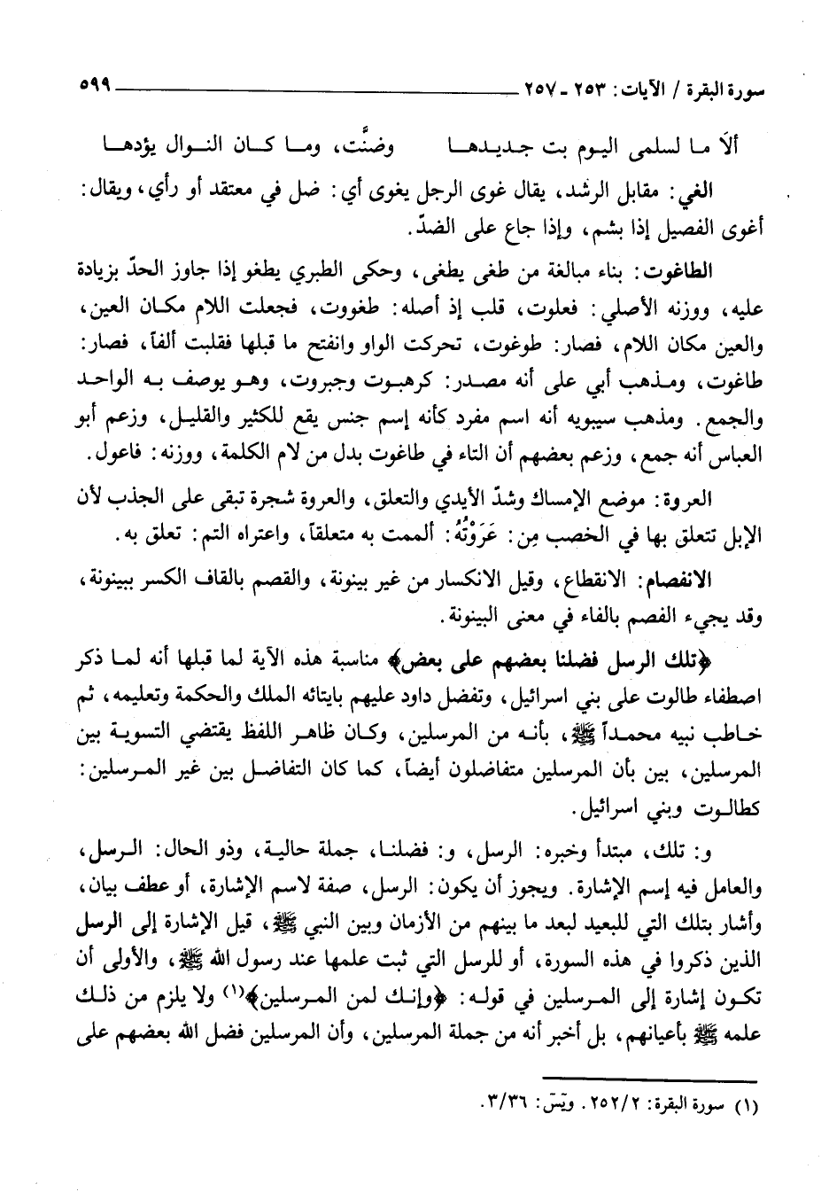 طَاغُوتَ، وَمَذْهَبُ أَبِي عَلِيٍّ أَنَّهُ مَصْدَرٌ: كَرَهَبُوتٍ وَجَبَرُوتٍ، وَهُوَ يُوصَفُ بِهِ الْوَاحِدُ وَالْجَمْعُ. وَمَذْهَبُ سِيبَوَيْهِ أَنَّهُ اسْمٌ مُفْرَدٌ كَأَنَّهُ اسْمُ جِنْسٍ يَقَعُ لِلْكَثِيرِ وَالْقَلِيلِ، وَزَعَمَ أَبُو الْعَبَّاسِ أَنَّهُ جَمْعٌ، وَزَعَمَ بَعْضُهُمْ أَنَّ التَّاءَ فِي طَاغُوتَ بَدَلٌ مِنْ لَامِ الْكَلِمَةِ، وَوَزْنُهُ: فَاعُولٌ.
