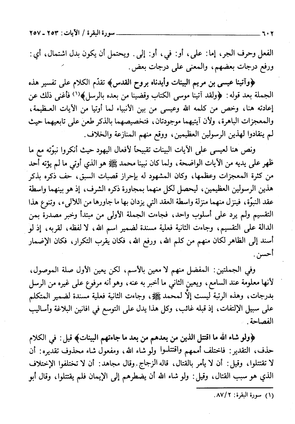 وَآتَيْنا عِيسَى ابْنَ مَرْيَمَ الْبَيِّناتِ وَأَيَّدْناهُ بِرُوحِ الْقُدُسِ تَقَدَّمَ الْكَلَامُ عَلَى تَفْسِيرِ هَذِهِ الْجُمْلَةِ بَعْدَ قَوْلِهِ: وَلَقَدْ آتَيْنا مُوسَى الْكِتابَ وَقَفَّيْنا مِنْ بَعْدِهِ بِالرُّسُلِ «1» فَأَغْنَى ذَلِكَ عَنْ إِعَادَتِهِ هُنَا، وَخَصَّ مَنْ كَلَّمَهُ اللَّهُ وَعِيسَى مِنْ بَيْنِ الْأَنْبِيَاءِ لِمَا أُوتِيَا مِنَ الْآيَاتِ الْعَظِيمَةِ، وَالْمُعْجِزَاتِ الْبَاهِرَةِ، وَلِأَنَّ آيَتَيْهِمَا مَوْجُودَتَانِ، فَتَخْصِيصُهُمَا بِالذِّكْرِ طَعْنٌ عَلَى تَابِعَيْهِمَا حَيْثُ لَمْ يَنْقَادُوا لِهَذَيْنِ الرَّسُولَيْنِ الْعَظِيمَيْنِ، وَوَقَعَ مِنْهُمُ الْمُنَازَعَةُ وَالْخِلَافُ.