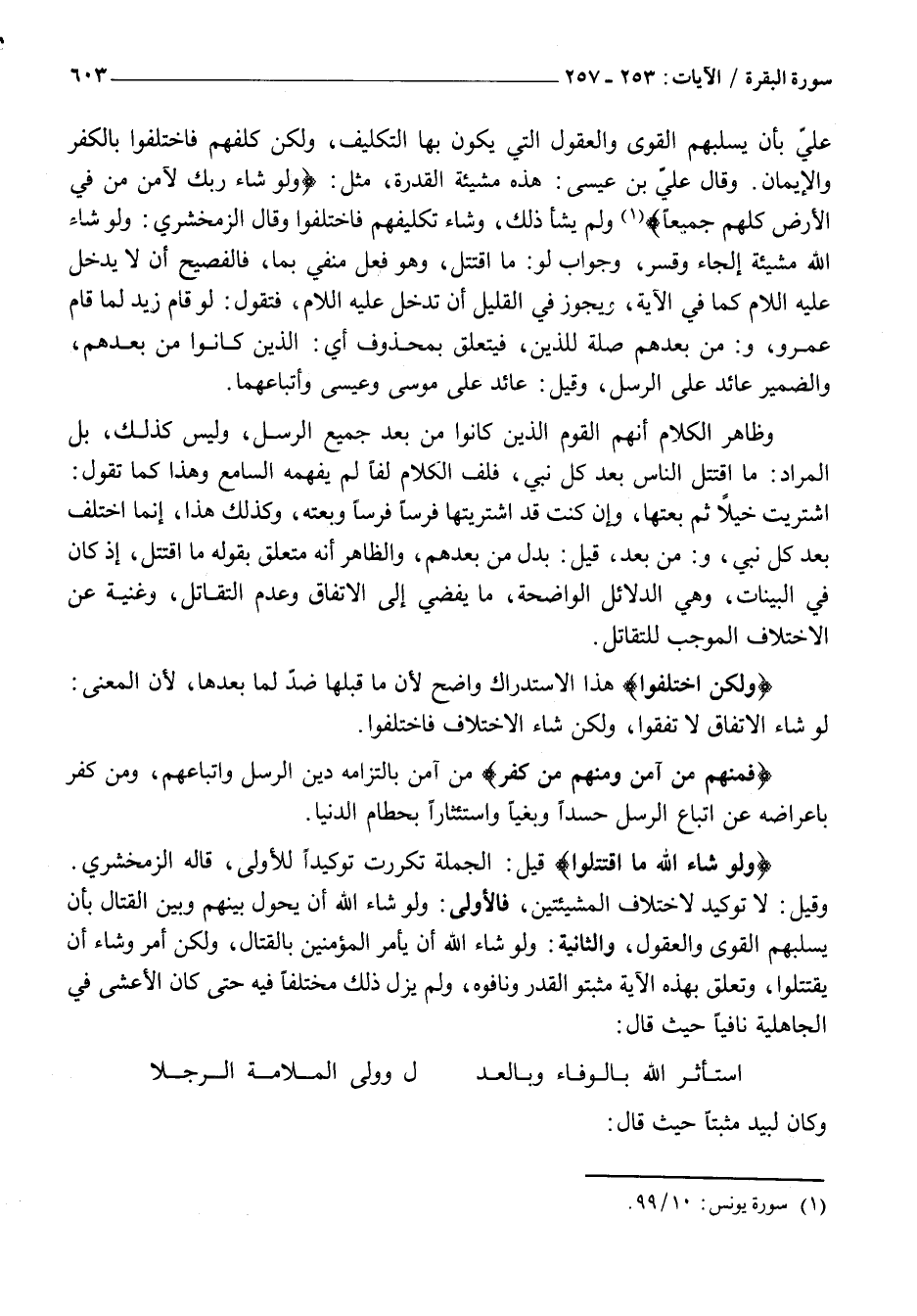 عَلِيٍّ بِأَنْ يَسْلُبَهُمُ الْقُوَى وَالْعُقُولَ الَّتِي يَكُونُ بِهَا التَّكْلِيفُ، وَلَكِنْ كَلَّفَهُمْ فَاخْتَلَفُوا بِالْكُفْرِ وَالْإِيمَانِ. وَقَالَ عَلِيُّ بْنُ عِيسَى: هَذِهِ مَشِيئَةُ الْقُدْرَةِ، مِثْلُ: وَلَوْ شاءَ رَبُّكَ لَآمَنَ مَنْ فِي الْأَرْضِ كُلُّهُمْ جَمِيعاً «1» وَلَمْ يَشَأْ ذَلِكَ، وَشَاءَ تَكْلِيفَهُمْ فَاخْتَلَفُوا وَقَالَ الزَّمَخْشَرِيُّ: وَلَوْ شَاءَ اللَّهُ مَشِيئَةَ إِلْجَاءٍ وَقَسْرٍ، وَجَوَابُ لَوْ: مَا اقْتَتَلَ، وَهُوَ فِعْلٌ مَنْفِيٌّ بِمَا، فَالْفَصِيحُ أَنْ لَا يَدْخُلَ عَلَيْهِ اللَّامُ كَمَا فِي الْآيَةِ، وَيَجُوزُ فِي الْقَلِيلِ أَنْ تَدْخُلَ عَلَيْهِ اللَّامُ، فَتَقُولُ: لَوْ قَامَ زَيْدٌ لَمَا قَامَ عَمْرٌو، وَ: مِنْ بَعْدِهِمْ صِلَةٌ لِلَّذِينَ، فَيَتَعَلَّقُ بِمَحْذُوفٍ أَيِ: الَّذِينَ كَانُوا مِنْ بَعْدِهِمْ، وَالضَّمِيرُ عَائِدٌ عَلَى الرُّسُلِ، وَقِيلَ: عَائِدٌ عَلَى مُوسَى وَعِيسَى وَأَتْبَاعِهِمَا.