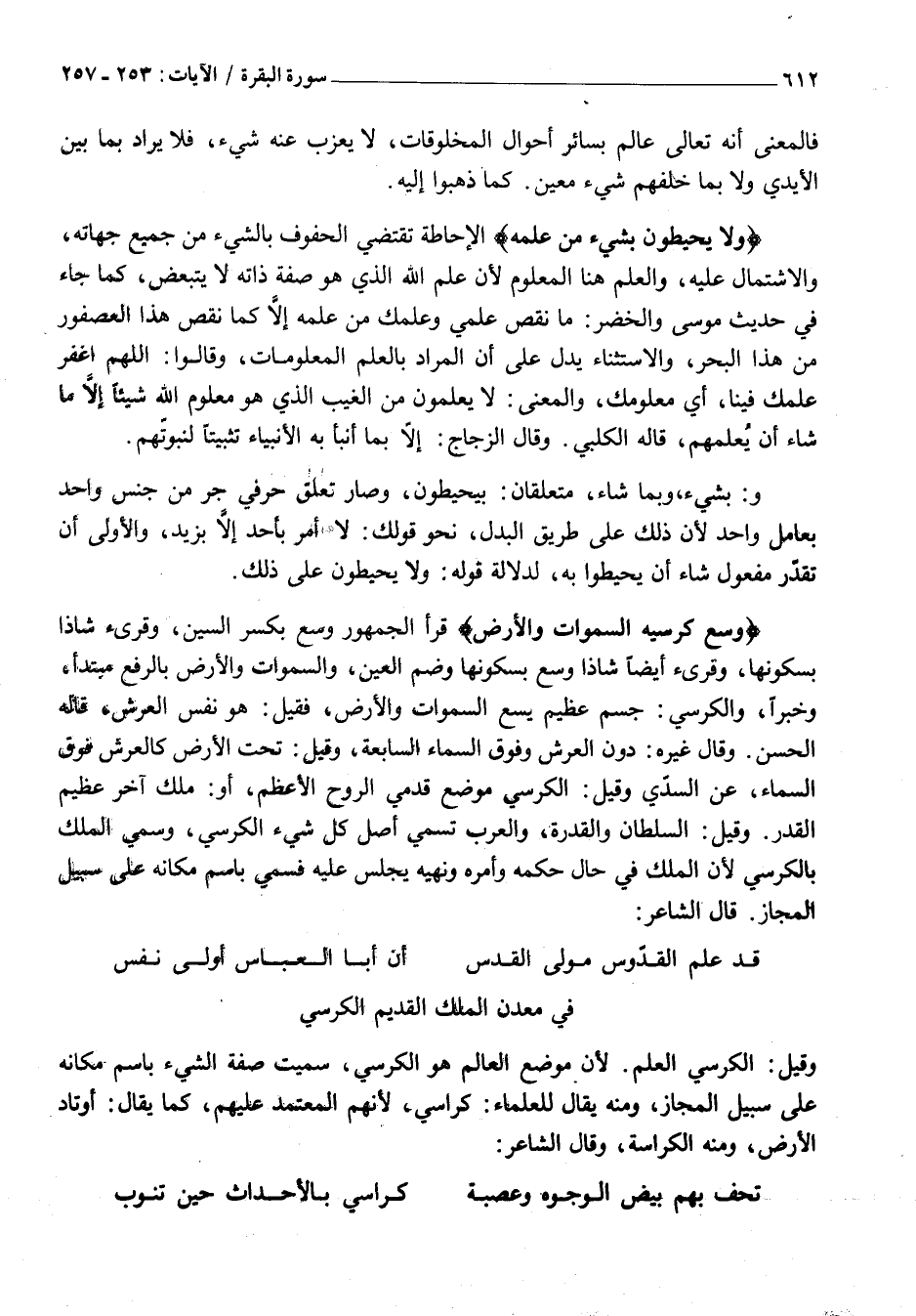 وَسِعَ كُرْسِيُّهُ السَّماواتِ وَالْأَرْضَ قَرَأَ الْجُمْهُورُ وَسِعَ بِكَسْرِ السِّينِ، وقرىء شاذا بسكونها، وقرىء أَيْضًا شَاذًّا وَسْعُ بِسُكُونِهَا وضم العين، والسموات وَالْأَرْضُ بِالرَّفْعِ مُبْتَدَأً، وَخَبَرًا، وَالْكُرْسِيُّ: جِسْمٌ عَظِيمٌ يَسَعُ السموات وَالْأَرْضَ، فَقِيلَ: هُوَ نَفْسُ الْعَرْشِ، قَالَهُ الْحَسَنُ. وَقَالَ غَيْرُهُ: دُونَ الْعَرْشِ وَفَوْقَ السَّمَاءِ السَّابِعَةِ، وَقِيلَ: تَحْتَ الْأَرْضِ كَالْعَرْشِ فَوْقَ السَّمَاءِ، عَنِ السُّدِّيِّ وَقِيلَ: الْكُرْسِيُّ مَوْضِعُ قَدَمَيِ الرُّوحِ الْأَعْظَمِ، أَوْ: مَلَكٌ آخَرُ عَظِيمُ الْقَدْرِ. وَقِيلَ: السُّلْطَانُ وَالْقُدْرَةُ، وَالْعَرَبُ تُسَمِّي أَصْلَ كُلِّ شَيْءٍ الْكُرْسِيَّ، وَسَمَّى الْمُلْكَ بِالْكُرْسِيِّ لِأَنَّ الْمُلْكَ فِي حَالِ حُكْمِهِ وَأَمْرِهِ وَنَهْيِهِ يَجْلِسُ عَلَيْهِ فَسُمِّيَ بِاسْمِ مَكَانِهِ عَلَى سَبِيلِ الْمَجَازِ. قَالَ الشَّاعِرُ: