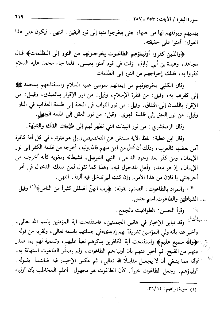 وَقَالَ ابْنُ عَطِيَّةَ: لَفْظُ الْآيَةِ مُسْتَغْنٍ عَنِ التَّخْصِيصِ، بَلْ هُوَ مُتَرَتِّبٌ فِي كُلِّ أُمَّةٍ كَافِرَةٍ آمَنَ بَعْضُهَا كَالْعَرَبِ، وَذَلِكَ أَنَّ كُلَّ مَنْ آمَنَ مِنْهُمْ فَاللَّهُ وَلِيُّهُ، أَخْرَجَهُ مِنْ ظُلْمَةِ الْكُفْرِ إِلَى نُورِ الْإِيمَانِ، وَمَنْ كَفَرَ بَعْدَ وُجُودِ الدَّاعِي، النَّبِيِّ الْمُرْسَلِ، فَشَيْطَانُهُ وَمُغْوِيهِ كَأَنَّهُ أَخْرَجَهُ مِنَ الْإِيمَانِ، إِذْ هُوَ مُعَدٌّ، وَأَهْلٌ لِلدُّخُولِ فِيهِ، وَهَذَا كَمَا تَقُولُ لِمَنْ مَنْعَكَ الدُّخُولَ فِي أَمْرٍ: