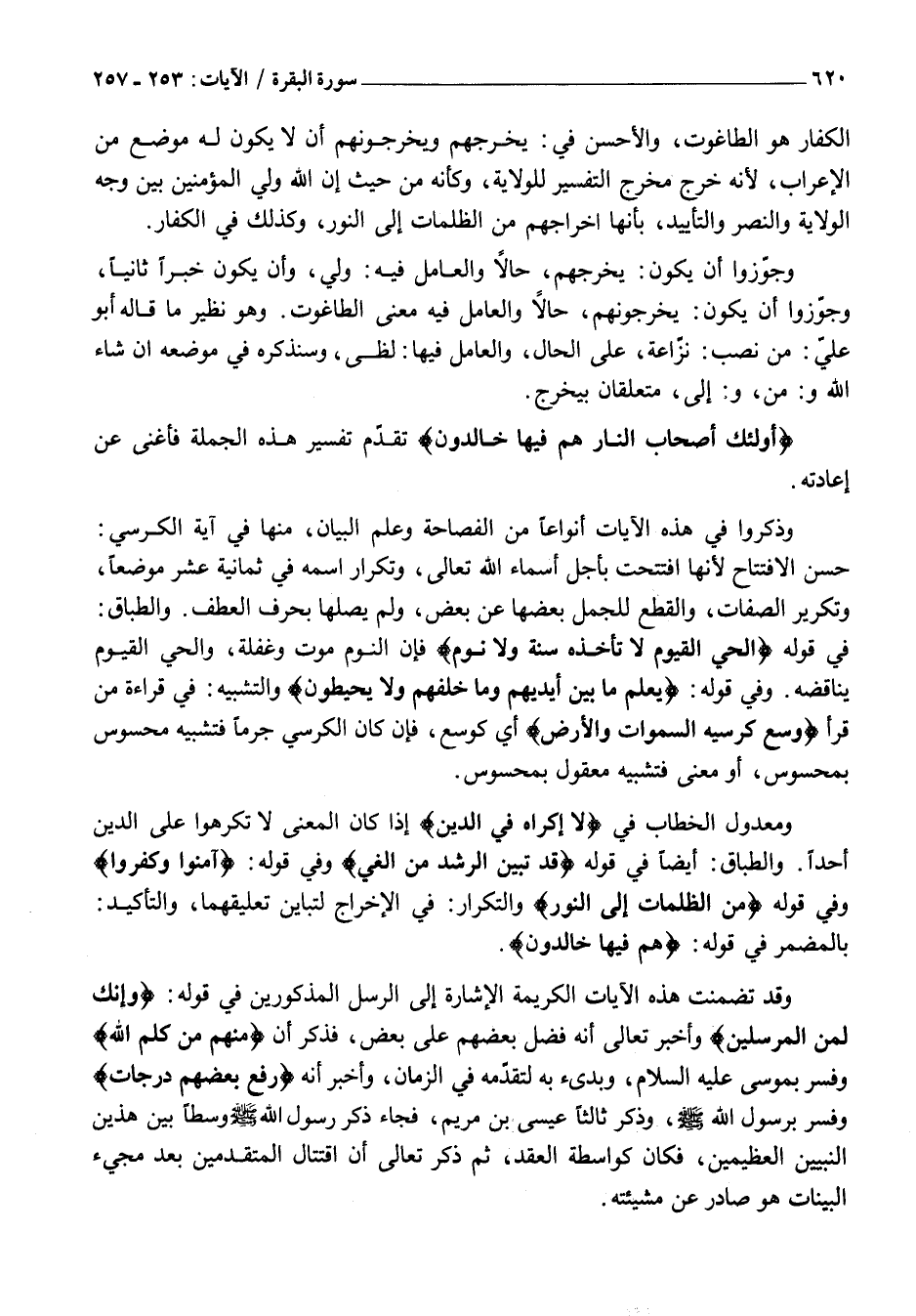 وَمَعْدُولُ الْخِطَابِ فِي لَا إِكْراهَ فِي الدِّينِ إِذَا كَانَ الْمَعْنَى لَا تُكْرِهُوا عَلَى الدِّينِ أَحَدًا. وَالطِّبَاقُ: أَيْضًا فِي قَوْلِهِ قَدْ تَبَيَّنَ الرُّشْدُ مِنَ الْغَيِّ وَفِي قَوْلِهِ: آمَنُوا وكَفَرُوا وَفِي قَوْلِهِ مِنَ الظُّلُماتِ إِلَى النُّورِ وَالتَّكْرَارُ: فِي الْإِخْرَاجِ لِتَبَايُنِ تَعْلِيقِهِمَا، وَالتَّأْكِيدُ: