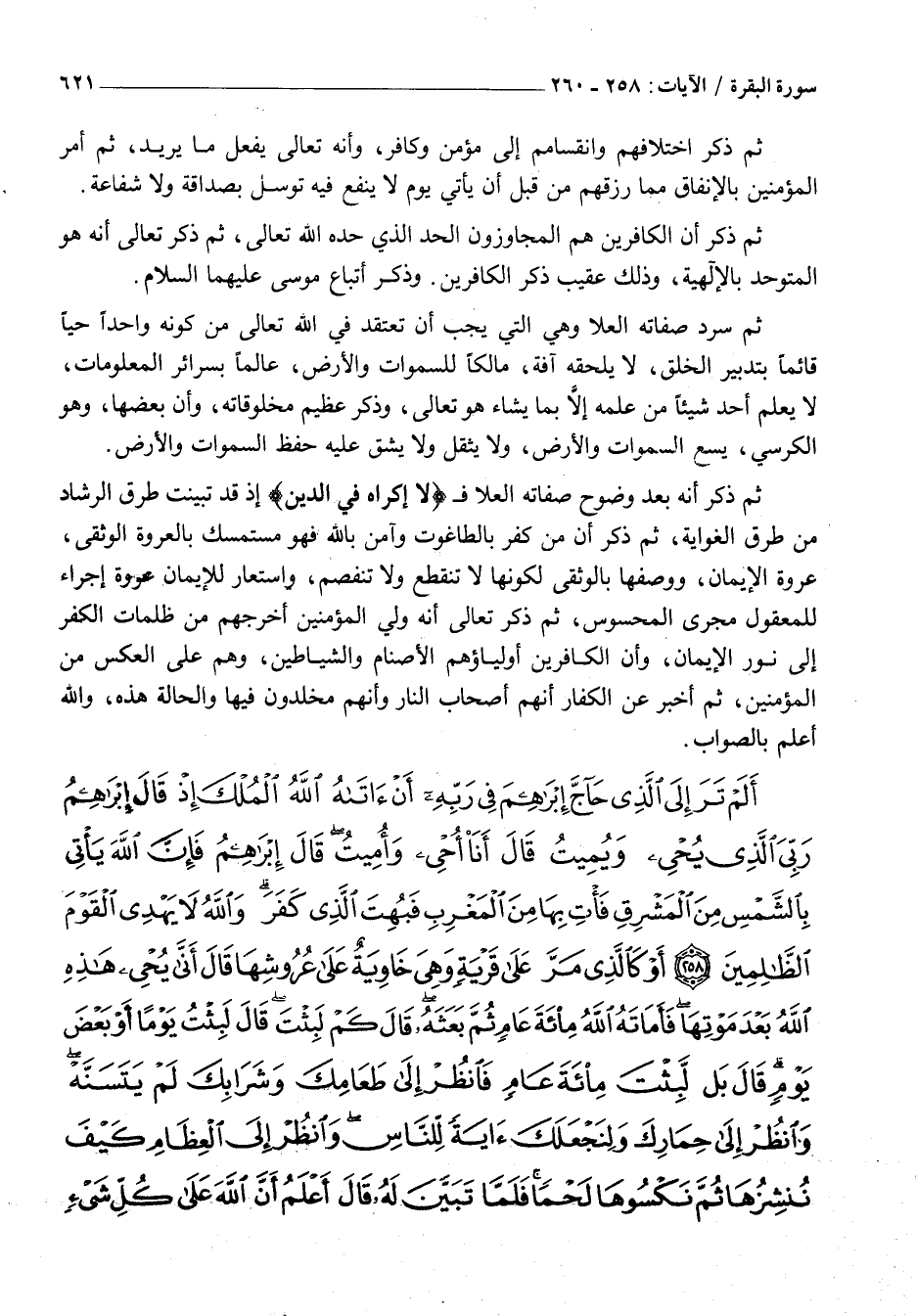 أَلَمْ تَرَ إِلَى الَّذِي حَاجَّ إِبْراهِيمَ فِي رَبِّهِ أَنْ آتاهُ اللَّهُ الْمُلْكَ إِذْ قالَ إِبْراهِيمُ رَبِّيَ الَّذِي يُحْيِي وَيُمِيتُ قالَ أَنَا أُحْيِي وَأُمِيتُ قالَ إِبْراهِيمُ فَإِنَّ اللَّهَ يَأْتِي بِالشَّمْسِ مِنَ الْمَشْرِقِ فَأْتِ بِها مِنَ الْمَغْرِبِ فَبُهِتَ الَّذِي كَفَرَ وَاللَّهُ لَا يَهْدِي الْقَوْمَ الظَّالِمِينَ (258) أَوْ كَالَّذِي مَرَّ عَلى قَرْيَةٍ وَهِيَ خاوِيَةٌ عَلى عُرُوشِها قالَ أَنَّى يُحْيِي هذِهِ اللَّهُ بَعْدَ مَوْتِها فَأَماتَهُ اللَّهُ مِائَةَ عامٍ ثُمَّ بَعَثَهُ قالَ كَمْ لَبِثْتَ قالَ لَبِثْتُ يَوْماً أَوْ بَعْضَ يَوْمٍ قالَ بَلْ لَبِثْتَ مِائَةَ عامٍ فَانْظُرْ إِلى طَعامِكَ وَشَرابِكَ لَمْ يَتَسَنَّهْ وَانْظُرْ إِلى حِمارِكَ وَلِنَجْعَلَكَ آيَةً لِلنَّاسِ وَانْظُرْ إِلَى الْعِظامِ كَيْفَ نُنْشِزُها ثُمَّ نَكْسُوها لَحْماً فَلَمَّا تَبَيَّنَ لَهُ قالَ أَعْلَمُ أَنَّ اللَّهَ عَلى كُلِّ شَيْءٍ قَدِيرٌ (259) وَإِذْ قالَ إِبْراهِيمُ رَبِّ أَرِنِي كَيْفَ تُحْيِ الْمَوْتى قالَ أَوَلَمْ تُؤْمِنْ قالَ بَلى وَلكِنْ لِيَطْمَئِنَّ قَلْبِي قالَ فَخُذْ أَرْبَعَةً مِنَ الطَّيْرِ فَصُرْهُنَّ إِلَيْكَ ثُمَّ اجْعَلْ عَلى كُلِّ جَبَلٍ مِنْهُنَّ جُزْءاً ثُمَّ ادْعُهُنَّ يَأْتِينَكَ سَعْياً وَاعْلَمْ أَنَّ اللَّهَ عَزِيزٌ حَكِيمٌ (260)