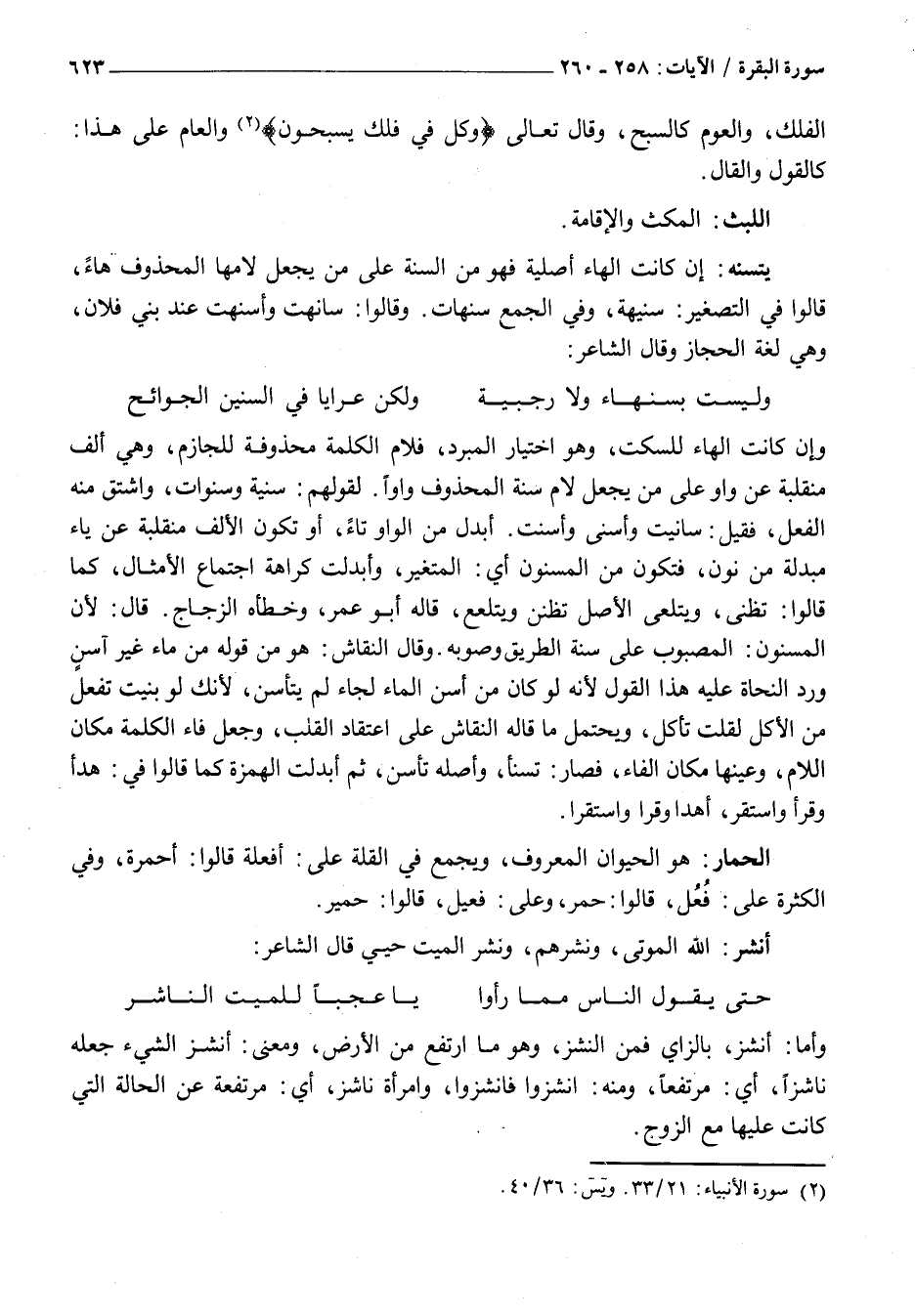 يَتَسَنَّهُ: إِنْ كَانَتِ الْهَاءُ أَصْلِيَّةً فَهُوَ مِنَ السَّنَةِ عَلَى مَنْ يَجْعَلُ لَامَهَا الْمَحْذُوفَ هَاءً، قَالُوا فِي التَّصْغِيرِ: سُنَيْهَةٌ، وَفِي الْجَمْعِ سَنَهَاتٌ. وَقَالُوا: سَانَهْتُ وَأَسْنَهْتُ عِنْدَ بَنِي فُلَانٍ، وَهِيَ لُغَةُ الْحِجَازِ وَقَالَ الشَّاعِرُ: