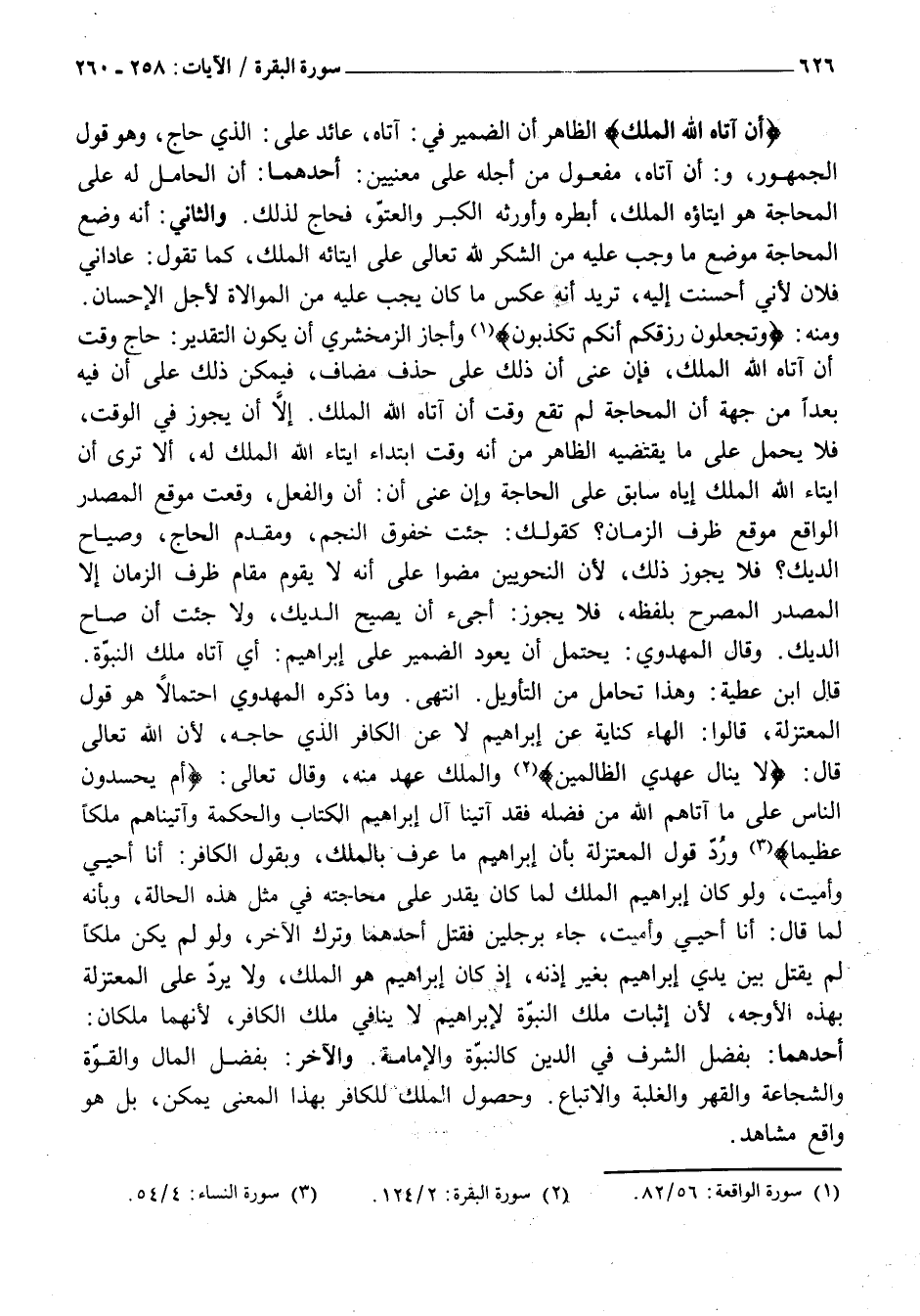 أَنْ آتاهُ اللَّهُ الْمُلْكَ الظَّاهِرُ أَنَّ الضَّمِيرَ فِي: آتَاهُ، عَائِدٌ عَلَى: الَّذِي حَاجَّ، وَهُوَ قَوْلُ الْجُمْهُورِ، و: أن آتَاهُ، مَفْعُولٌ مِنْ أَجْلِهِ عَلَى مَعْنَيَيْنِ: أَحَدُهُمَا: أَنَّ الْحَامِلَ لَهُ عَلَى الْمُحَاجَّةِ هُوَ إِيتَاؤُهُ الْمُلَكَ، أَبْطَرَهُ وَأَوْرَثَهُ الْكِبَرَ وَالْعُتُوَّ، فَحَاجَّ لِذَلِكَ. وَالثَّانِي: أَنَّهُ وَضَعَ الْمُحَاجَّةَ مَوْضِعَ مَا وَجَبَ عَلَيْهِ مِنَ الشُّكْرِ لِلَّهِ تَعَالَى عَلَى إِيتَائِهِ الْمُلْكَ، كَمَا تَقُولُ: عَادَانِي فُلَانٌ لِأَنِّي أَحْسَنْتُ إِلَيْهِ، تُرِيدُ أَنَّهُ عَكَسَ مَا كَانَ يَجِبُ عَلَيْهِ مِنَ الْمُوَالَاةِ لِأَجْلِ الْإِحْسَانِ.