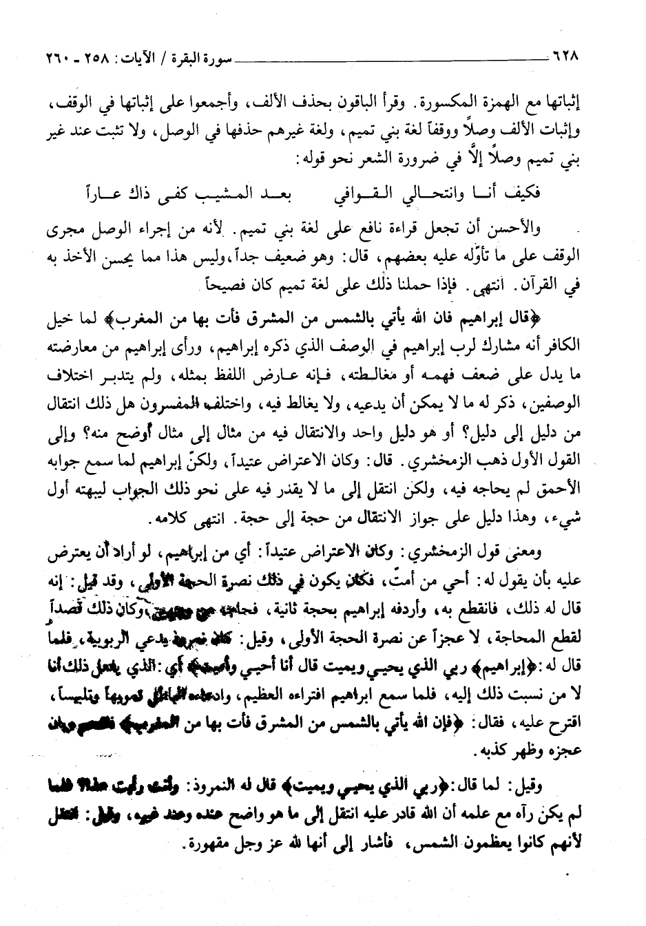 وَمَعْنَى قَوْلِ الزَّمَخْشَرِيِّ: وَكَانَ الِاعْتِرَاضُ عَتِيدًا: أَيْ مِنْ إِبْرَاهِيمَ، لَوْ أَرَادَ أَنْ يَعْتَرِضَ عَلَيْهِ بِأَنْ يَقُولَ لَهُ: أَحْيِ مَنْ أَمَتَّ، فَكَانَ يَكُونُ فِي ذَلِكَ نُصْرَةُ الْحُجَّةِ الْأُولَى، وَقَدْ قِيلَ: إِنَّهُ قَالَ لَهُ ذَلِكَ، فَانْقَطَعَ بِهِ، وَأَرْدَفَهُ إِبْرَاهِيمُ بِحُجَّةٍ ثَانِيَةٍ، فَحَاجَّهُ مِنْ وَجْهَيْنِ، وَكَانَ ذَلِكَ قَصْدًا لِقَطْعِ الْمُحَاجَّةِ، لَا عَجْزًا عَنْ نُصْرَةِ الْحُجَّةِ الْأُولَى، وَقِيلَ: كَانَ نُمْرُوذُ يَدَّعِي الرُّبُوبِيَّةَ، فَلَمَّا قَالَ لَهُ: إِبْراهِيمَ رَبِّيَ الَّذِي يُحْيِي وَيُمِيتُ قالَ أَنَا أُحْيِي وَأُمِيتُ أَيِ: الَّذِي يَفْعَلُ ذَلِكَ أَنَا لَا مَنْ نَسَبْتَ ذَلِكَ إِلَيْهِ، فَلَمَّا سَمِعَ إِبْرَاهِيمُ افْتِرَاءَهُ الْعَظِيمَ، وَادِّعَاءَهُ الْبَاطِلَ تَمْوِيهًا وَتَلْبِيسًا، اقْتَرَحَ عَلَيْهِ، فَقَالَ: فَإِنَّ اللَّهَ يَأْتِي بِالشَّمْسِ مِنَ الْمَشْرِقِ فَأْتِ بِها مِنَ الْمَغْرِبِ فَأُفْحِمَ وَبَانَ عَجْزُهُ وَظَهَرَ كَذِبُهُ.