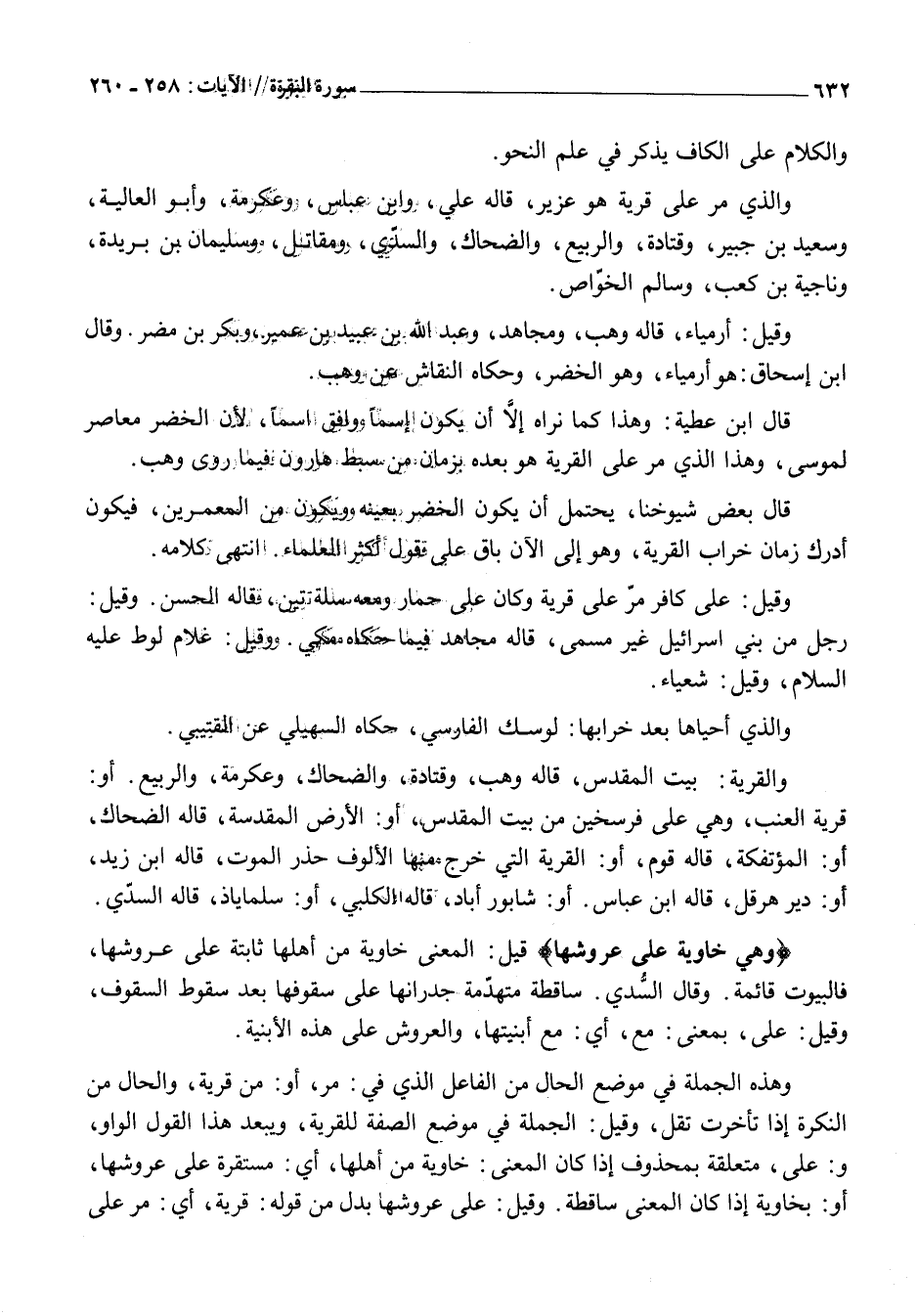 وَالَّذِي مَرَّ عَلَى قَرْيَةٍ هُوَ عُزَيْرٌ، قَالَهُ عَلِيٌّ، وَابْنُ عَبَّاسٍ، وَعِكْرِمَةُ، وَأَبُو الْعَالِيَةِ، وَسَعِيدُ بْنُ جُبَيْرٍ، وَقَتَادَةُ، وَالرَّبِيعُ، وَالضَّحَّاكُ، وَالسُّدِّيُّ، وَمُقَاتِلٌ، وَسُلَيْمَانُ بْنُ بُرَيْدَةَ، وَنَاجِيَةُ بْنُ كَعْبٍ، وَسَالِمٌ الْخَوَّاصُ.