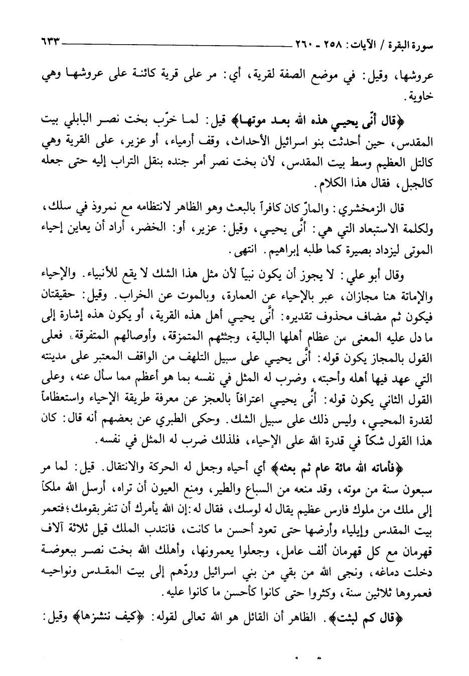 وَقَالَ أَبُو عَلِيٍّ: لَا يَجُوزُ أَنْ يَكُونَ نَبِيًّا لِأَنَّ مِثْلَ هَذَا الشَّكِّ لَا يَقَعُ لِلْأَنْبِيَاءِ. وَالْإِحْيَاءُ وَالْإِمَاتَةُ هُنَا مَجَازَانِ، عَبَّرَ بِالْإِحْيَاءِ عَنِ الْعِمَارَةِ، وَبِالْمَوْتِ عَنِ الْخَرَابِ. وَقِيلَ: حَقِيقَتَانِ فَيَكُونُ ثُمَّ مُضَافٌ مَحْذُوفٌ تَقْدِيرُهُ: أَنَّى يُحْيِي أَهْلَ هَذِهِ الْقَرْيَةِ، أَوْ يَكُونُ هَذِهِ إِشَارَةً إِلَى مَا دَلَّ عَلَيْهِ الْمَعْنَى مِنْ عِظَامِ أَهْلِهَا الْبَالِيَةِ، وَجُثَثِهِمُ الْمُتَمَزِّقَةِ، وَأَوْصَالِهِمُ الْمُتَفَرِّقَةِ، فَعَلَى الْقَوْلِ بِالْمَجَازِ يَكُونُ قَوْلُهُ: أَنَّى يُحْيِي عَلَى سَبِيلِ التَّلَهُّفِ مِنَ الْوَاقِفِ الْمُعْتَبَرِ عَلَى مَدِينَتِهِ الَّتِي عَهِدَ فِيهَا أَهْلَهُ وَأَحِبَّتَهُ، وَضَرَبَ لَهُ الْمَثَلَ فِي نَفْسِهِ بِمَا هُوَ أَعْظَمُ مِمَّا سَأَلَ عَنْهُ، وَعَلَى الْقَوْلِ الثَّانِي يَكُونُ قَوْلُهُ: أَنَّى يُحْيِي اعْتِرَافًا بِالْعَجْزِ عَنْ مَعْرِفَةِ طَرِيقَةِ الْإِحْيَاءِ وَاسْتِعْظَامًا لِقُدْرَةِ الْمُحْيِي، وَلَيْسَ ذَلِكَ عَلَى سَبِيلِ الشَّكِّ. وَحَكَى الطَّبَرِيُّ عَنْ بَعْضِهِمْ أَنَّهُ قَالَ: كَانَ هَذَا الْقَوْلُ شَكًّا فِي قُدْرَةِ اللَّهِ عَلَى الْإِحْيَاءِ، فَلِذَلِكَ ضَرَبَ لَهُ الْمَثَلَ فِي نَفْسِهِ.