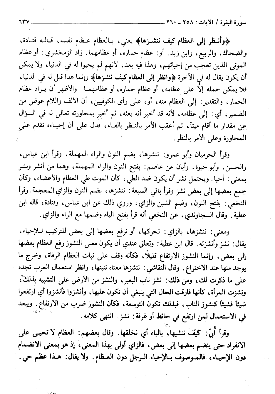 وَانْظُرْ إِلَى الْعِظامِ كَيْفَ نُنْشِزُها يَعْنِي، بِالْعِظَامِ عِظَامَ نَفْسِهِ، قَالَهُ قَتَادَةُ، وَالضَّحَّاكُ، وَالرَّبِيعُ، وَابْنُ زَيْدٍ. أَوْ: عظام حماره، أو عظامهما. زَادَ الزَّمَخْشَرِيُّ: أَوْ عِظَامَ الْمَوْتَى الَّذِينَ تَعَجَّبَ مِنْ إِحْيَائِهِمْ، وَهَذَا فِيهِ بُعْدٌ، لِأَنَّهُمْ لَمْ يُحْيُوا لَهُ فِي الدُّنْيَا، وَلَا يُمْكِنُ أَنْ يَكُونَ يُقَالُ لَهُ فِي الْآخِرَةِ وَانْظُرْ إِلَى الْعِظامِ كَيْفَ نُنْشِزُها وَإِنَّمَا هَذَا قِيلَ لَهُ فِي الدُّنْيَا، فَلَا يُمْكِنُ حَمْلُهُ إِلَّا عَلَى عِظَامِهِ، أَوْ عظام حماره، أو عظامهما. وَالْأَظْهَرُ أَنْ يُرَادَ عِظَامُ الْحِمَارِ، وَالتَّقْدِيرُ: إِلَى الْعِظَامِ مِنْهُ، أَوْ، عَلَى رَأَيِ الْكُوفِيِّينَ، أَنَّ الْأَلِفَ وَاللَّامَ عِوَضٌ مِنَ الضَّمِيرِ، أَيْ: إِلَى عِظَامِهِ، لِأَنَّهُ قَدْ أَخْبَرَ أَنَّهُ بَعَثَهُ، ثُمَّ أَخْبَرَ بِمُحَاوَرَتِهِ تَعَالَى لَهُ فِي السُّؤَالِ عَنْ مِقْدَارِ مَا أَقَامَ مَيِّتًا، ثُمَّ أَعْقَبَ الْأَمْرَ بِالنَّظَرِ بِالْفَاءِ، فَدَلَّ عَلَى أَنَّ إِحْيَاءَهُ تَقَدَّمَ عَلَى الْمُحَاوَرَةِ وَعَلَى الْأَمْرِ بِالنَّظَرِ.