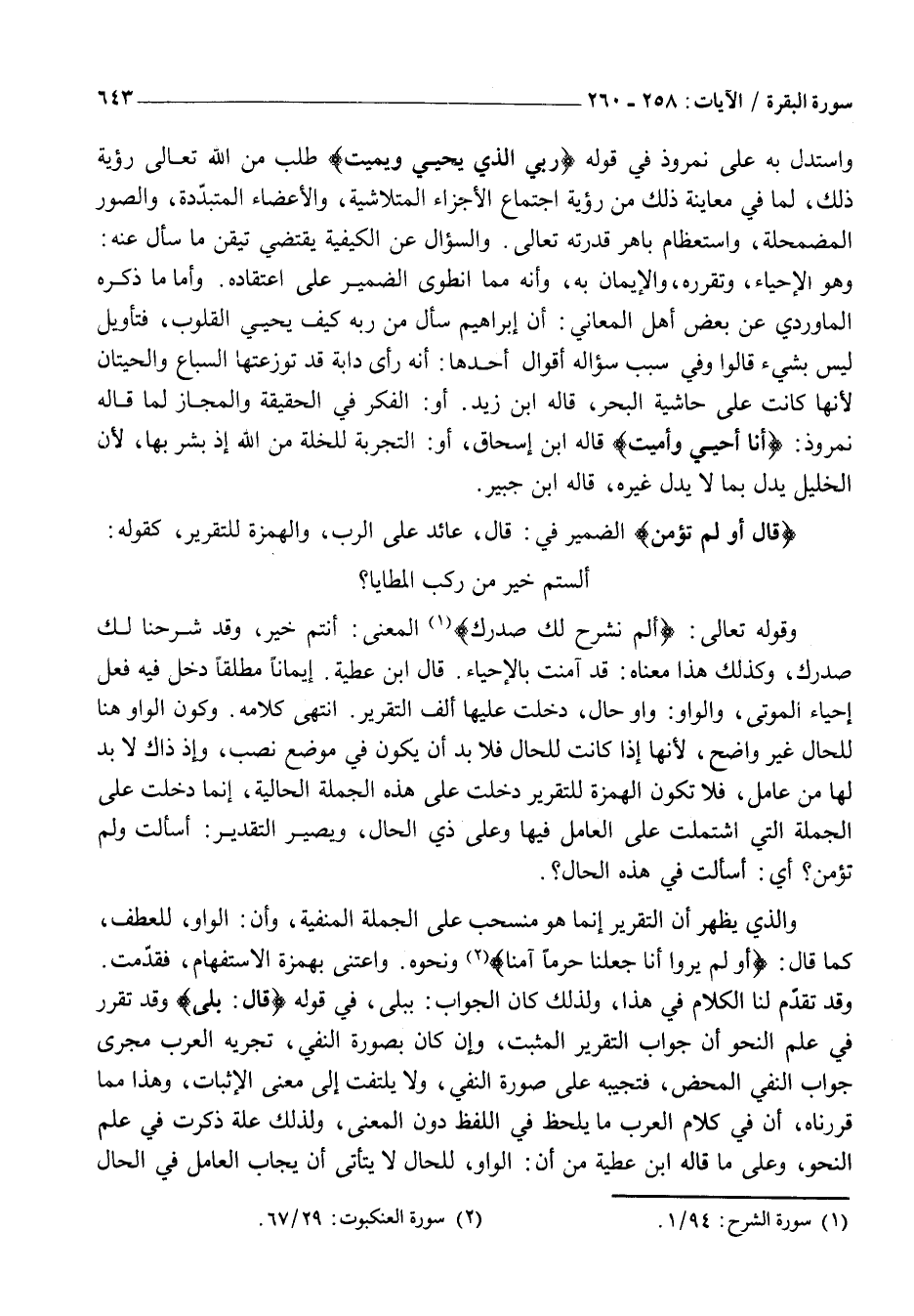 وَقَوْلِهِ تَعَالَى: أَلَمْ نَشْرَحْ لَكَ صَدْرَكَ «1» الْمَعْنَى: أَنْتُمْ خَيْرُ، وَقَدْ شَرَحْنَا لَكَ صَدْرَكَ، وَكَذَلِكَ هَذَا مَعْنَاهُ: قَدْ آمَنْتُ بِالْإِحْيَاءِ. قَالَ ابْنُ عَطِيَّةَ. إِيمَانًا مُطْلَقًا دَخَلَ فِيهِ فِعْلُ إِحْيَاءِ الْمَوْتَى، وَالْوَاوُ: وَاوُ حَالٍ، دَخَلَتْ عَلَيْهَا أَلِفُ التَّقْرِيرِ. انْتَهَى كَلَامُهُ. وَكَوْنُ الْوَاوِ هُنَا لِلْحَالِ غَيْرَ وَاضِحٍ، لِأَنَّهَا إِذَا كَانَتْ لِلْحَالِ فلابد أَنْ يَكُونَ فِي مَوْضِعِ نَصْبٍ، وَإِذْ ذَاكَ لَا بُدَّ لَهَا مَنْ عَامِلٍ، فَلَا تَكُونُ الْهَمْزَةُ لِلتَّقْرِيرِ دَخَلَتْ عَلَى هَذِهِ الْجُمْلَةِ الْحَالِيَّةِ، إِنَّمَا دَخَلَتْ عَلَى الْجُمْلَةِ الَّتِي اشْتَمَلَتْ عَلَى الْعَامِلِ فِيهَا وَعَلَى ذِي الْحَالِ، وَيَصِيرُ التَّقْدِيرُ: أَسَأَلْتَ وَلَمْ تُؤْمِنْ؟ أَيْ: أَسَأَلْتَ فِي هَذِهِ الْحَالِ؟.