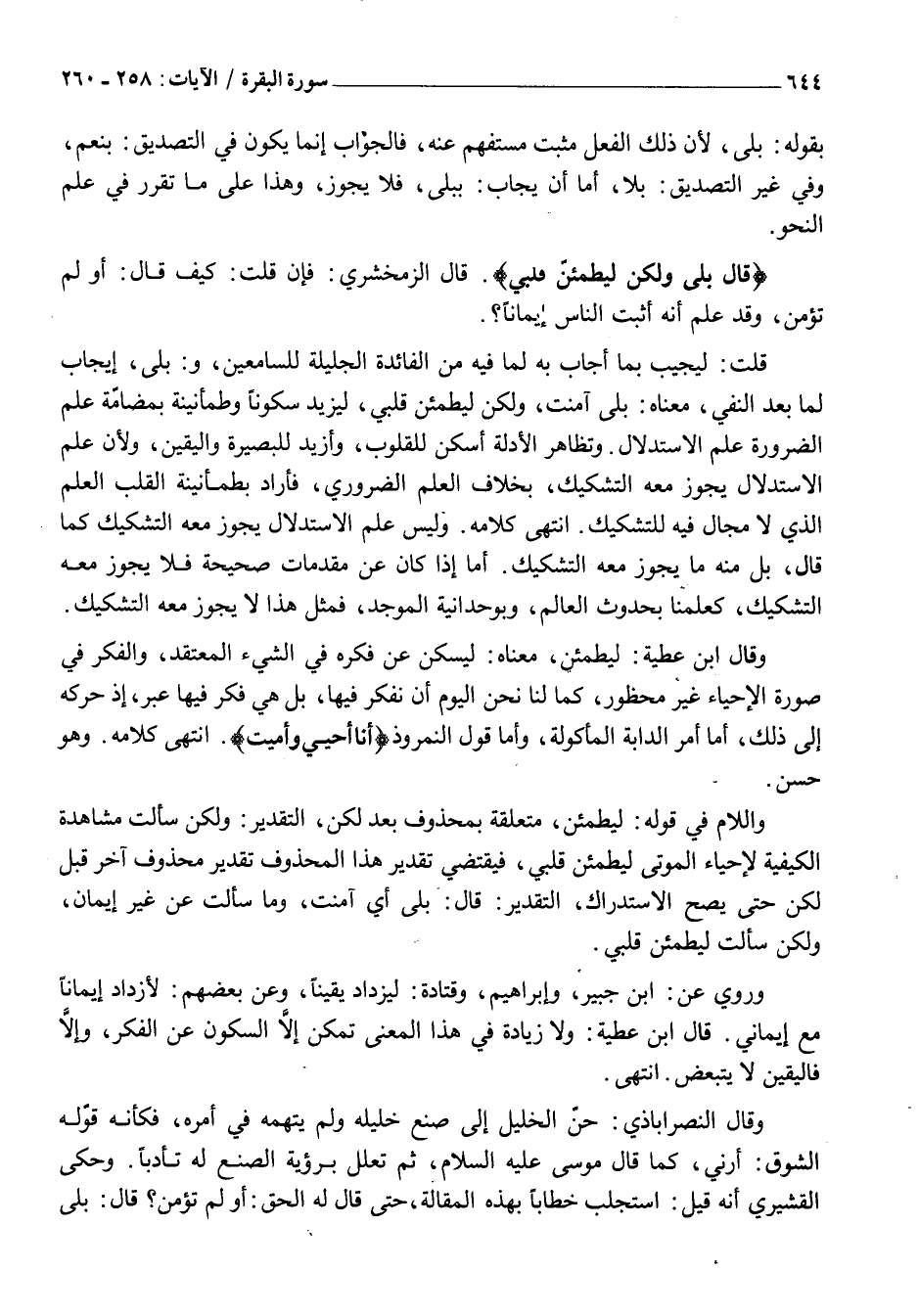 قالَ بَلى وَلكِنْ لِيَطْمَئِنَّ قَلْبِي. قَالَ الزَّمَخْشَرِيُّ: فَإِنْ قُلْتَ: كَيْفَ قَالَ: أو لم تُؤْمِنْ، وَقَدْ عَلِمَ أَنَّهُ أَثْبَتُ النَّاسِ إِيمَانًا؟.