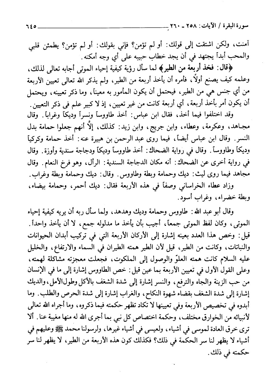 قالَ: فَخُذْ أَرْبَعَةً مِنَ الطَّيْرِ لَمَّا سَأَلَ رُؤْيَةَ كَيْفِيَّةِ إِحْيَاءِ الْمَوْتَى أَجَابَهُ تَعَالَى لِذَلِكَ، وَعَلَّمَهُ كَيْفَ يَصْنَعُ أَوَّلًا، فَأَمْرَهُ أَنْ يَأْخُذَ أَرْبَعَةً مِنَ الطَّيْرِ، وَلَمْ يَذْكُرِ اللَّهُ تَعَالَى تَعْيِينَ الْأَرْبَعَةِ مِنْ أَيِّ جِنْسٍ هِيَ مِنَ الطَّيْرِ، فَيُحْتَمَلُ أَنْ يَكُونَ الْمَأْمُورُ بِهِ مُعَيَّنًا، وَمَا ذُكِرَ تَعْيِينُهُ، وَيُحْتَمَلُ أَنْ يَكُونَ أُمِرَ بِأَخْذِ أَرْبَعَةٍ، أَيْ أَرْبَعَةً كَانَتْ مِنْ غَيْرِ تَعْيِينٍ، إِذْ لَا كَبِيرَ عِلْمٍ فِي ذِكْرِ التَّعْيِينِ.