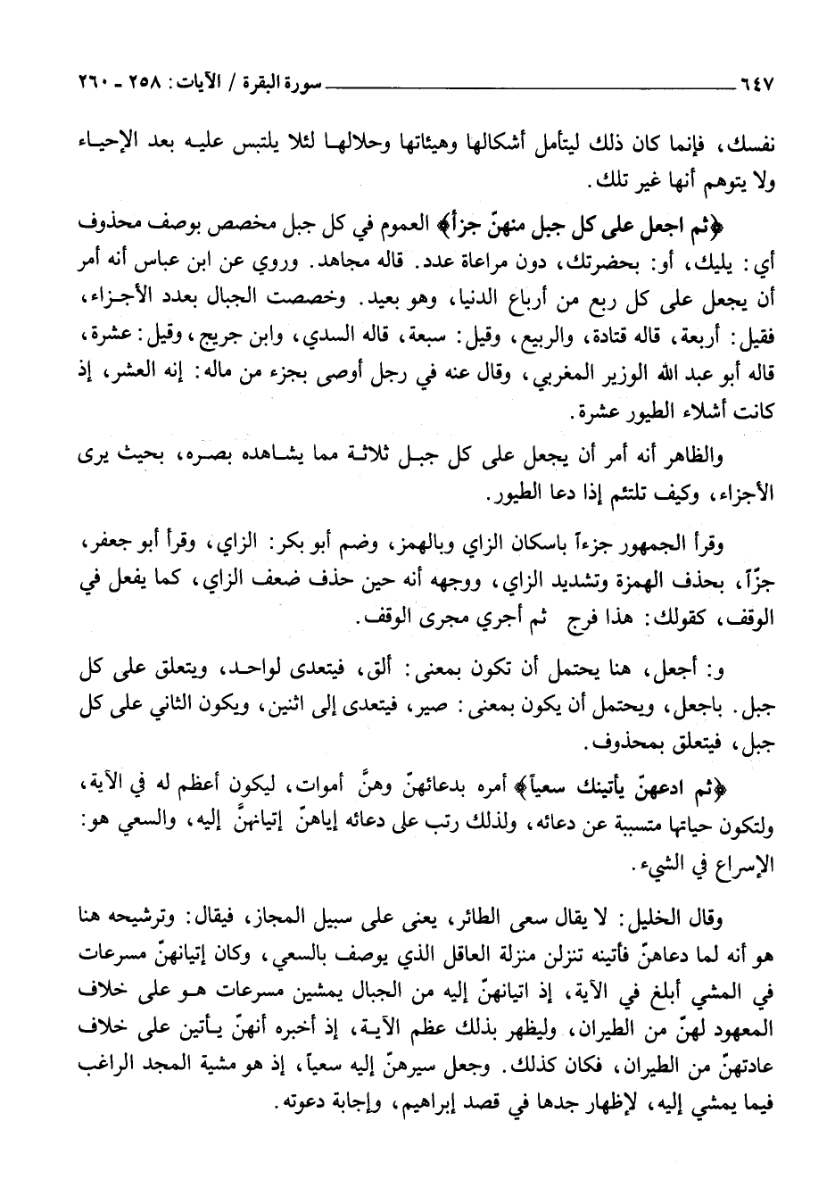 ثُمَّ اجْعَلْ عَلى كُلِّ جَبَلٍ مِنْهُنَّ جُزْءاً الْعُمُومُ فِي كُلِّ جَبَلٍ مُخَصَّصٍ بِوَصْفٍ مَحْذُوفٍ أَيْ: يَلِيكَ، أَوْ: بِحَضْرَتِكَ، دُونَ مُرَاعَاةِ عَدَدٍ. قَالَهُ مُجَاهِدٌ. وَرُوِيَ عَنِ ابْنِ عَبَّاسٍ أَنَّهُ أُمِرَ أَنْ يَجْعَلَ عَلَى كُلِّ رُبْعٍ مِنْ أَرْبَاعِ الدُّنْيَا، وَهُوَ بَعِيدٌ. وَخُصِّصَتِ الْجِبَالُ بِعَدَدِ الْأَجْزَاءِ، فَقِيلَ: أَرْبَعَةٌ، قَالَهُ قَتَادَةُ، وَالرَّبِيعُ، وَقِيلَ: سَبْعَةٌ، قَالَهُ السُّدِّيُّ، وَابْنُ جُرَيْجٍ، وَقِيلَ: عَشَرَةٌ، قَالَه أَبُو عَبْدِ اللَّهِ الْوَزِيرُ الْمَغْرِبِيُّ، وَقَالَ عَنْهُ فِي رَجُلٍ أَوْصَى بِجُزْءٍ مِنْ مَالِهِ: إِنَّهُ الْعُشْرُ، إِذْ كَانَتْ أَشْلَاءُ الطُّيُورِ عَشَرَةً.