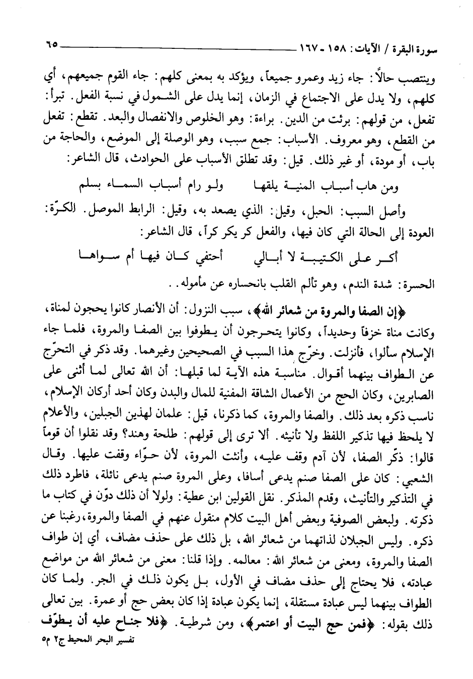 إِنَّ الصَّفا وَالْمَرْوَةَ مِنْ شَعائِرِ اللَّهِ، سَبَبُ النُّزُولِ: أَنَّ الْأَنْصَارَ كَانُوا يَحُجُّونَ لِمَنَاةَ، وَكَانَتْ مَنَاةُ خَزَفًا وَحَدِيدًا، وَكَانُوا يَتَحَرَّجُونَ أَنْ يَطُوفُوا بَيْنَ الصَّفَا وَالْمَرْوَةِ، فَلَمَّا جَاءَ الْإِسْلَامُ سَأَلُوا، فَأُنْزِلَتْ. وَخُرِّجَ هَذَا السَّبَبُ فِي الصَّحِيحَيْنِ وَغَيْرِهِمَا. وَقَدْ ذُكِرَ فِي التَّحَرُّجِ عَنِ الطَّوَافِ بَيْنَهُمَا أَقْوَالٌ. مُنَاسَبَةُ هَذِهِ الْآيَةِ لِمَا قَبْلَهَا: أَنَّ اللَّهَ تَعَالَى لَمَّا أَثْنَى عَلَى الصَّابِرِينَ، وَكَانَ الْحَجُّ مِنَ الْأَعْمَالِ الشَّاقَّةِ الْمُفْنِيَةِ لِلْمَالِ وَالْبَدَنِ وَكَانَ أَحَدَ أَرْكَانِ الْإِسْلَامِ، نَاسَبَ ذِكْرُهُ بَعْدَ ذَلِكَ. وَالصَّفَا وَالْمَرْوَةُ، كَمَا ذَكَرْنَا، قِيلَ: عَلَمَانِ لِهَذَيْنِ الْجَبَلَيْنِ، وَالْأَعْلَامُ لَا يُلْحَظُ فِيهَا تَذْكِيرُ اللَّفْظِ وَلَا تَأْنِيثُهُ. أَلَا تَرَى إِلَى قَوْلِهِمْ: طَلْحَةُ وَهِنْدٌ؟ وَقَدْ نَقَلُوا أَنَّ قَوْمًا قَالُوا: ذُكِّرَ الصَّفَا، لِأَنَّ آدَمَ وَقَفَ عَلَيْهِ، وَأُنِّثَتِ الْمَرْوَةُ، لِأَنَّ حَوَّاءَ وَقَفَتْ عَلَيْهَا. وَقَالَ الشَّعْبِيُّ: كَانَ عَلَى الصَّفَا صَنَمٌ يُدْعَى إِسَافًا، وَعَلَى الْمَرْوَةِ صَنَمٌ يُدْعَى نَائِلَةَ، فَاطَّرَدَ ذَلِكَ فِي التَّذْكِيرِ وَالتَّأْنِيثِ، وَقُدِّمَ الْمُذَكَّرُ. نَقَلَ الْقَوْلَيْنِ ابْنُ عَطِيَّةَ: وَلَوْلَا أَنَّ ذَلِكَ دُوِّنَ فِي كِتَابٍ مَا ذَكَرْتُهُ. وَلِبَعْضِ الصُّوفِيَّةِ وَبَعْضِ أَهْلِ الْبَيْتِ كَلَامٌ مَنْقُولٌ عَنْهُمْ فِي الصَّفَا وَالْمَرْوَةِ، رَغِبْنَا عَنْ ذِكْرِهِ. وَلَيْسَ الْجَبَلَانِ لِذَاتِهِمَا مِنْ شَعَائِرِ اللَّهِ، بَلْ ذَلِكَ عَلَى حَذْفِ مُضَافٍ، أَيْ إِنَّ طَوَافَ الصَّفَا وَالْمَرْوَةِ، وَمَعْنَى مِنْ شَعَائِرِ اللَّهِ: مَعَالِمِهِ. وَإِذَا قُلْنَا: مَعْنَى مِنْ شَعَائِرِ اللَّهِ مِنْ مَوَاضِعِ عِبَادَتِهِ، فَلَا يُحْتَاجُ إِلَى حَذْفِ مضاف فِي الْأَوَّلِ، بَلْ يَكُونُ ذَلِكَ فِي الْجَرِّ. وَلَمَّا كَانَ الطَّوَافُ بَيْنَهُمَا لَيْسَ عِبَادَةً مُسْتَقِلَّةً، إِنَّمَا يَكُونُ عِبَادَةً إِذَا كَانَ بَعْضَ حَجٍّ أَوْ عُمْرَةٍ. بَيَّنَ تَعَالَى ذَلِكَ بِقَوْلِهِ: فَمَنْ حَجَّ الْبَيْتَ أَوِ اعْتَمَرَ، وَمَنْ شَرْطِيَّةٌ. فَلا جُناحَ عَلَيْهِ أَنْ يَطَّوَّفَ