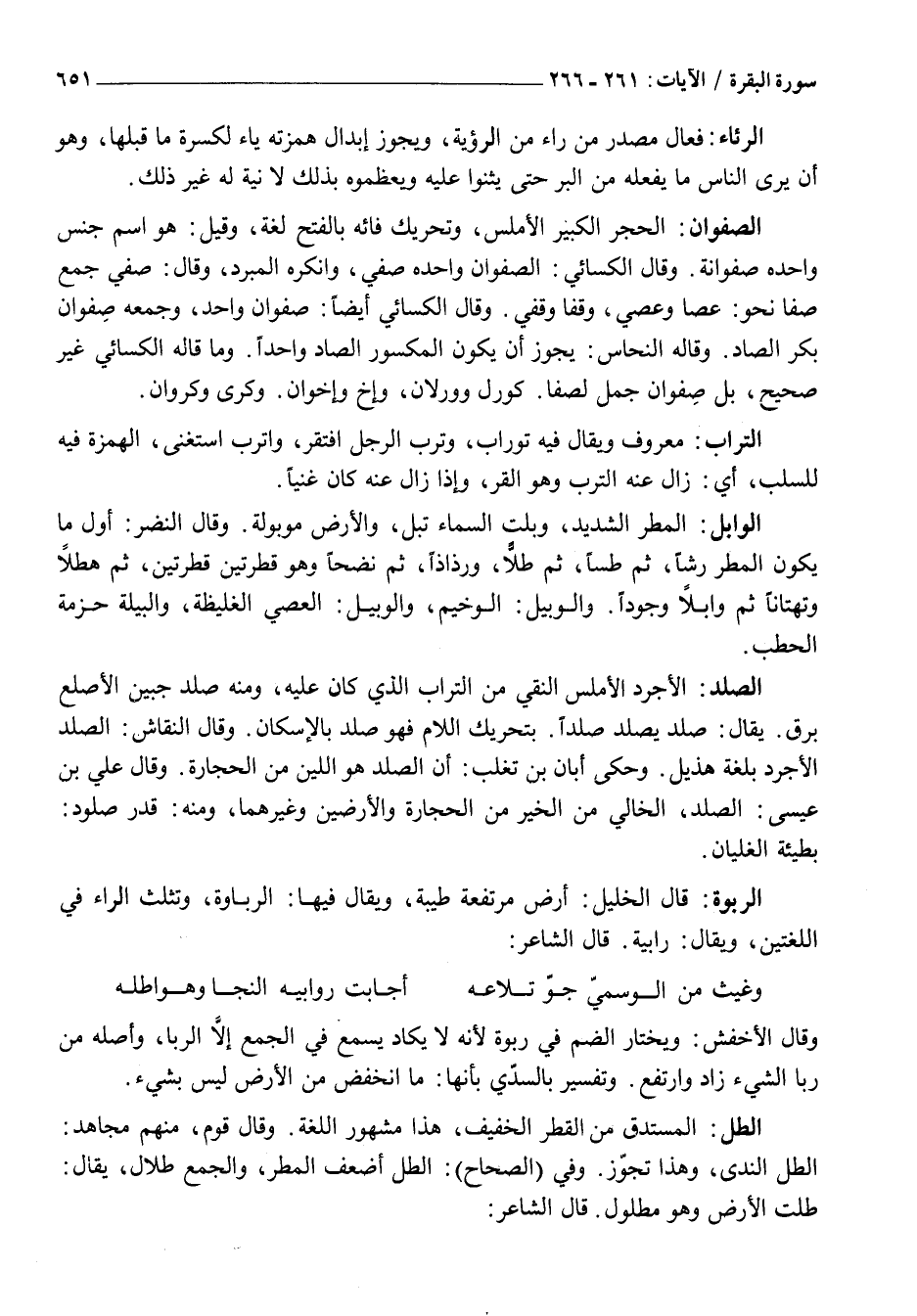 الصَّفْوَانُ: الْحَجَرُ الْكَبِيرُ الْأَمْلَسُ، وَتَحْرِيكُ فَائِهِ بِالْفَتْحِ لُغَةٌ، وَقِيلَ: هُوَ اسْمُ جِنْسٍ وَاحِدُهُ صَفْوَانَةٌ. وَقَالَ الْكِسَائِيُّ: الصَّفْوَانُ وَاحِدُهُ صَفِيٌّ، وَأَنْكَرَهُ الْمُبَرِّدُ، وَقَالَ: صُفِيٌّ جَمْعُ صَفَا نَحْوَ: عَصَا وَعُصِيٍّ، وَقَفَا وَقُفِيٍّ. وَقَالَ الْكِسَائِيُّ أَيْضًا: صَفْوَانٌ وَاحِدٌ، وَجَمْعُهُ صفوان بكر الصَّادِ. وَقَالَهُ النَّحَاسُ: يَجُوزُ أَنْ يَكُونَ الْمَكْسُورُ الصَّادِ وَاحِدًا. وَمَا قَالَهُ الْكِسَائِيُّ غَيْرُ صَحِيحٍ، بَلْ صَفْوَانٌ جمل لِصَفَا. كَوَرَلٍ وَوِرْلَانِ، وَأَخٍ وَإِخْوَانٍ. وَكَرَى وَكَرَوَانِ.