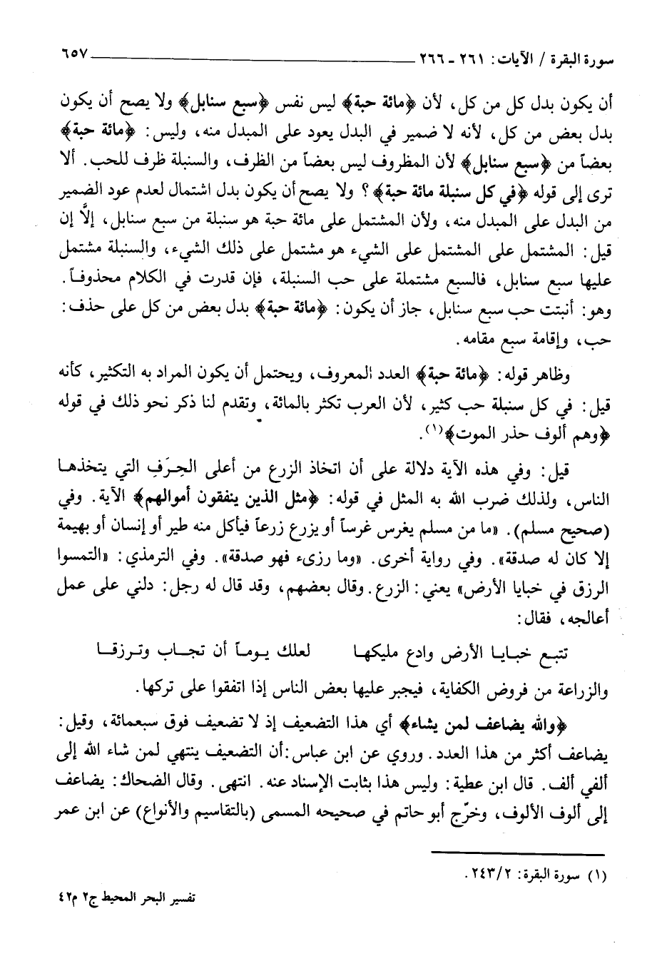 وَظَاهِرُ قَوْلِهِ: مِائَةُ حَبَّةٍ الْعَدَدُ الْمَعْرُوفُ، وَيُحْتَمَلُ أَنْ يَكُونَ الْمُرَادُ بِهِ التَّكْثِيرَ، كَأَنَّهُ قِيلَ: فِي كُلِّ سُنْبُلَةٍ حَبٌّ كَثِيرٌ، لِأَنَّ الْعَرَبَ تُكْثِرُ بِالْمِائَةِ، وَتَقَدَّمَ لَنَا ذِكْرُ نَحْوِ ذَلِكَ فِي قَوْلِهِ وَهُمْ أُلُوفٌ حَذَرَ الْمَوْتِ «1» .