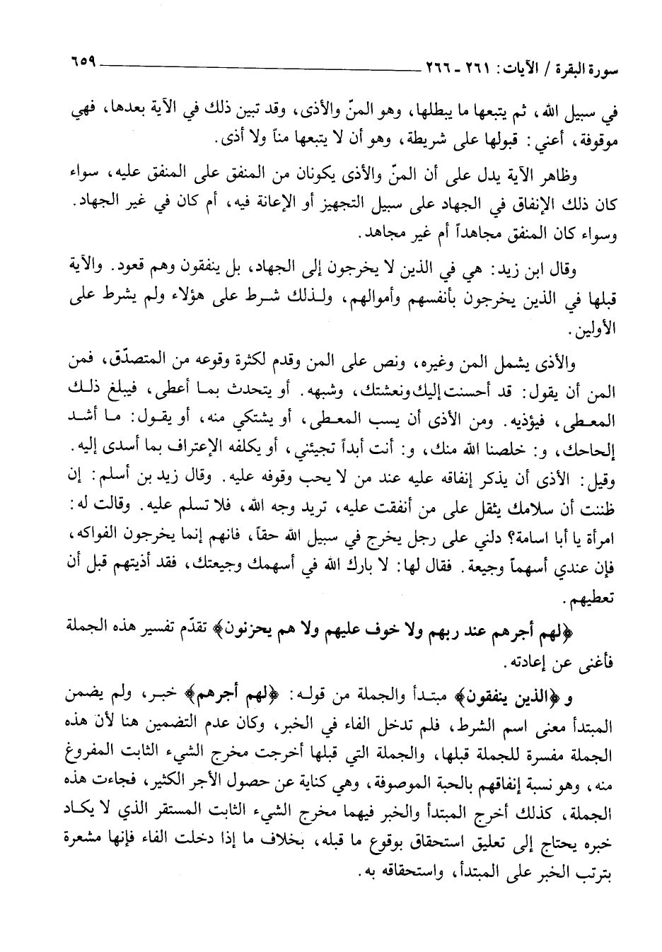 فِي سَبِيلِ اللَّهِ، ثُمَّ يَتْبَعُهَا مَا يُبْطِلُهَا، وَهُوَ الْمَنُّ وَالْأَذَى، وَقَدْ تَبَيَّنَ ذَلِكَ فِي الْآيَةِ بَعْدَهَا، فَهِيَ مَوْقُوفَةٌ، أَعْنِي: قَبُولَهَا عَلَى شَرِيطَةٍ، وَهُوَ أَنْ لَا يُتْبِعَهَا مَنًّا وَلَا أَذًى.