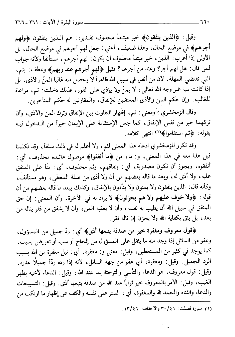 وَقَالَ الزَّمَخْشَرِيُّ: وَمَعْنَى: ثُمَّ، إِظْهَارُ التَّفَاوُتِ بَيْنَ الْإِنْفَاقِ وَتَرْكِ الْمَنِّ وَالْأَذَى، وَأَنَّ تَرْكَهُمَا خَيْرٌ مِنْ نَفْسِ الْإِنْفَاقِ، كَمَا جَعَلَ الاستقامة عَلَى الْإِيمَانِ خَيْرًا مِنَ الدُّخُولِ فِيهِ بِقَوْلِهِ: ثُمَّ اسْتَقامُوا «1» انْتَهَى كَلَامُهُ.