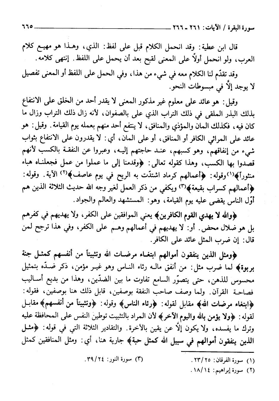 وَقِيلَ: هُوَ عَائِدٌ عَلَى مَعْلُومٍ غَيْرِ مَذْكُورِ الْمَعْنَى لَا يَقْدِرُ أَحَدٌ مِنَ الْخَلْقِ عَلَى الِانْتِفَاعِ بِذَلِكَ الْبَذْرِ الْمُلْقَى فِي ذَلِكَ التُّرَابِ الَّذِي على بالصفوان، لِأَنَّهُ زَالَ ذَلِكَ التُّرَابُ وَزَالَ مَا كَانَ فِيهِ، فَكَذَلِكَ الْمَانُّ وَالْمُؤْذِي وَالْمُنَافِقُ، لَا يَنْتَفِعُ أَحَدٌ مِنْهُمْ بِعَمَلِهِ يَوْمَ الْقِيَامَةِ. وَقِيلَ: هُوَ عَائِدٌ عَلَى الْمُرَائِي الْكَافِرِ أَوِ الْمُنَافِقِ، أَوْ عَلَى الْمَانِّ، أَيْ: لَا يَقْدِرُونَ عَلَى الِانْتِفَاعِ بِثَوَابِ شَيْءٍ مِنْ إِنْفَاقِهِمْ، وَهُوَ كَسْبُهُمْ، عِنْدَ حَاجَتِهِمْ إِلَيْهِ، وَعَبَّرُوا عَنِ النَّفَقَةِ بِالْكَسْبِ لِأَنَّهُمْ قَصَدُوا بِهَا الْكَسْبَ، وَهَذَا كَقَوْلِهِ تَعَالَى: وَقَدِمْنا إِلى مَا عَمِلُوا مِنْ عَمَلٍ فَجَعَلْناهُ هَباءً مَنْثُوراً «1» وَقَوْلِهِ: أَعْمالُهُمْ كَرَمادٍ اشْتَدَّتْ بِهِ الرِّيحُ فِي يَوْمٍ عاصِفٍ «2» الْآيَةَ. وَقَوْلِهِ: