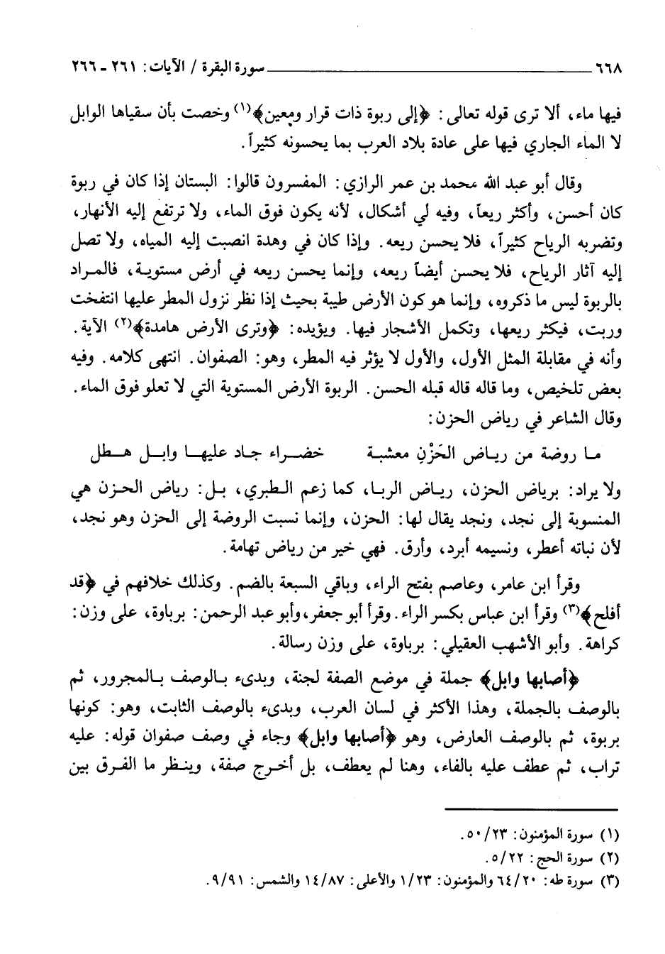 وَقَالَ أَبُو عَبْدِ اللَّهِ محمد بن عُمَرَ الرَّازِيُّ: الْمُفَسِّرُونَ قَالُوا: الْبُسْتَانُ إِذَا كَانَ فِي رَبْوَةٍ كَانَ أَحْسَنَ، وَأَكْثَرَ رِيعًا، وَفِيهِ لِي إِشْكَالٌ، لِأَنَّهُ يَكُونُ فَوْقَ الْمَاءِ، وَلَا تَرْتَفِعُ إِلَيْهِ الْأَنْهَارُ، وَتَضْرِبُهُ الرِّيَاحُ كَثِيرًا، فَلَا يُحْسَنُ رِيعُهُ. وَإِذَا كَانَ فِي وَهْدَةٍ انْصَبَّتْ إِلَيْهِ الْمِيَاهُ، وَلَا تَصِلُ إِلَيْهِ آثَارُ الرِّيَاحِ، فَلَا يُحْسَنُ أَيْضًا رِيعُهُ، وَإِنَّمَا يُحْسَنُ رِيعُهُ فِي أَرْضٍ مُسْتَوِيَةٍ، فَالْمُرَادُ بِالرَّبْوَةِ لَيْسَ مَا ذَكَرُوهُ، وَإِنَّمَا هُوَ كَوْنُ الْأَرْضِ طَيِّبَةً بِحَيْثُ إِذَا نُظِرَ نُزُولُ الْمَطَرِ عَلَيْهَا انْتَفَخَتْ وَرَبَتْ، فَيَكْثُرُ رِيعُهَا، وَتَكْمُلُ الْأَشْجَارُ فِيهَا. وَيُؤَيِّدُهُ: وَتَرَى الْأَرْضَ هامِدَةً «2» الْآيَةَ.