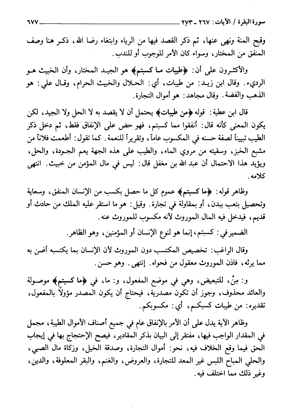 قَالَ ابْنُ عَطِيَّةَ: قَوْلُهُ مِنْ طَيِّباتِ يُحْتَمَلُ أَنْ لَا يُقْصَدَ بِهِ لَا الْحِلُّ وَلَا الْجَيِّدُ، لَكِنْ يَكُونُ الْمَعْنَى كَأَنَّهُ قَالَ: أَنْفِقُوا مِمَّا كَسَبْتُمْ، فَهُوَ حَضٌّ عَلَى الْإِنْفَاقِ فَقَطْ، ثُمَّ دَخَلَ ذِكْرُ الطَّيِّبِ تَبْيِينًا لِصِفَةِ حُسْنِهِ فِي الْمَكْسُوبِ عَامًّا، وَتَقْرِيرًا لِلنِّعْمَةِ. كَمَا تَقُولُ: أَطْعَمْتُ فُلَانًا مِنْ مَشْبَعِ الْخُبْزِ، وَسَقَيْتُهُ مِنْ مَرْوِيِّ الْمَاءِ، وَالطَّيِّبُ عَلَى هَذِهِ الْجِهَةِ يَعُمُّ الْجَوْدَةَ، وَالْحِلَّ، وَيُؤَيِّدُ هَذَا الِاحْتِمَالَ أَنَّ عَبْدَ اللَّهِ بْنَ مُغَفَّلٍ قَالَ: لَيْسَ فِي مَالِ الْمُؤْمِنِ مِنْ خَبِيثٍ. انْتَهَى كَلَامُهُ.