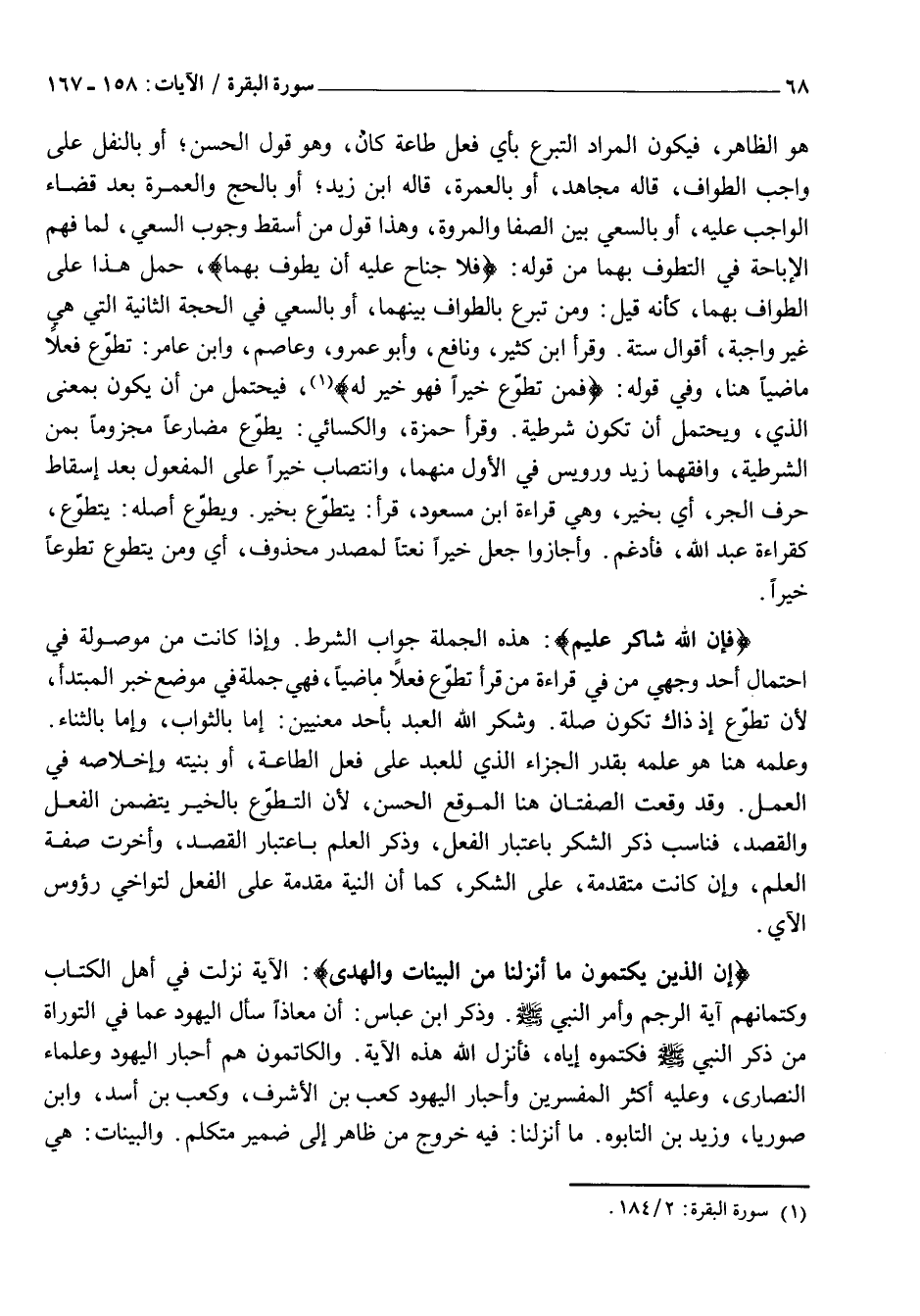 فَإِنَّ اللَّهَ شاكِرٌ عَلِيمٌ: هَذِهِ الْجُمْلَةُ جَوَابُ الشَّرْطِ. وَإِذَا كَانَتْ مَنْ مَوْصُولَةً فِي احْتِمَالِ أَحَدِ وَجْهَيْ مَنْ فِي قِرَاءَةِ مَنْ قَرَأَ تَطَوَّعَ فِعْلًا مَاضِيًا، فَهِيَ جُمْلَةٌ فِي مَوْضِعِ خَبَرِ الْمُبْتَدَأِ، لِأَنَّ تَطَوَّعَ إِذْ ذَاكَ تَكُونُ صِلَةً. وَشُكْرُ اللَّهِ الْعَبْدَ بِأَحَدِ مَعْنَيَيْنِ: إِمَّا بِالثَّوَابِ، وَإِمَّا بِالثَّنَاءِ.