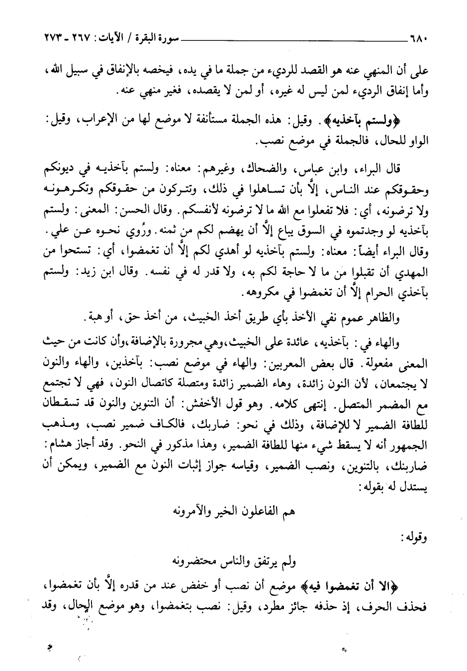قَالَ الْبَرَاءُ، وَابْنُ عَبَّاسٍ، وَالضَّحَّاكُ، وَغَيْرُهُمْ: مَعْنَاهُ: وَلَسْتُمْ بِآخِذِيهِ فِي دُيُونِكُمْ وَحُقُوقِكُمْ عِنْدَ النَّاسِ، إِلَّا بِأَنْ تَسَاهَلُوا فِي ذَلِكَ، وَتَتْرُكُونَ مِنْ حُقُوقِكُمْ وَتَكْرَهُونَهُ وَلَا تَرْضَوْنَهُ، أَيْ: فَلَا تَفْعَلُوا مَعَ اللَّهِ مَا لَا تَرْضَوْنَهُ لِأَنْفُسِكُمْ.