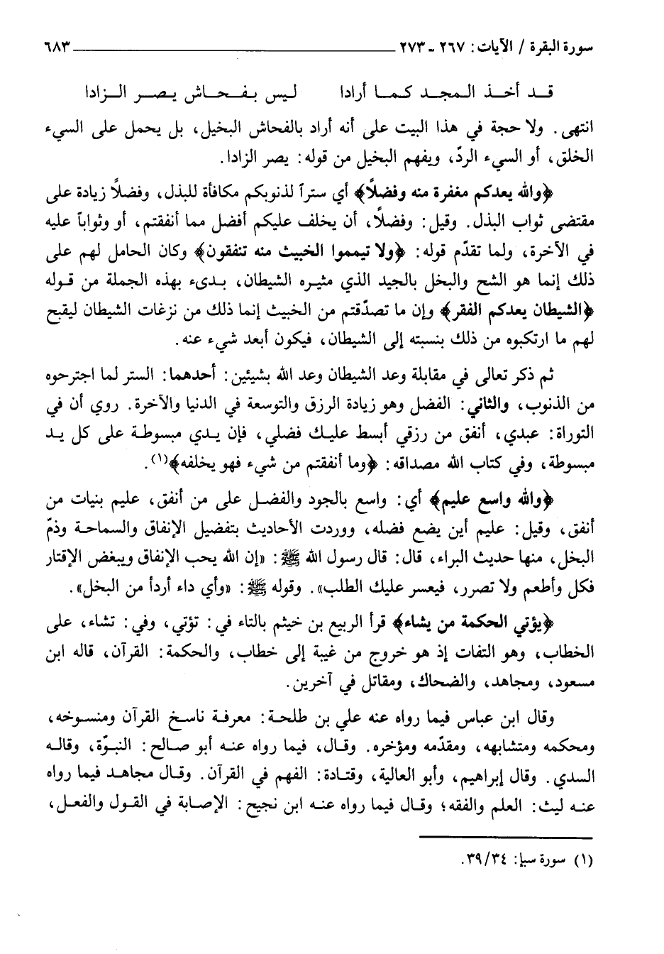وَاللَّهُ يَعِدُكُمْ مَغْفِرَةً مِنْهُ وَفَضْلًا أَيْ سَتْرًا لِذُنُوبِكُمْ مُكَافَأَةً لِلْبَذْلِ، وَفَضْلًا زِيَادَةٌ عَلَى مُقْتَضَى ثَوَابِ الْبَذْلِ. وَقِيلَ: وَفَضْلًا، أَنْ يُخْلِفَ عَلَيْكُمْ أَفْضَلَ مِمَّا أَنْفَقْتُمْ، أَوْ وَثَوَابًا عَلَيْهِ فِي الْآخِرَةِ، وَلَمَّا تَقَدَّمَ قَوْلُهُ: وَلا تَيَمَّمُوا الْخَبِيثَ مِنْهُ تُنْفِقُونَ وَكَانَ الْحَامِلَ لَهُمْ عَلَى ذَلِكَ إِنَّمَا هُوَ الشُّحُّ وَالْبُخْلُ بِالْجَيِّدِ الَّذِي مُثِيرُهُ الشَّيْطَانُ، بدىء بِهَذِهِ الْجُمْلَةِ مِنْ قَوْلِهِ الشَّيْطانُ يَعِدُكُمُ الْفَقْرَ وَإِنَّ مَا تَصَدَّقْتُمْ مِنَ الْخَبِيثِ إِنَّمَا ذَلِكَ مِنْ نَزَغَاتِ الشَّيْطَانِ لِيُقَبِّحَ لَهُمْ مَا ارْتَكَبُوهُ مِنْ ذَلِكَ بِنِسْبَتِهِ إِلَى الشَّيْطَانِ، فَيَكُونُ أَبْعَدَ شَيْءٍ عَنْهُ.