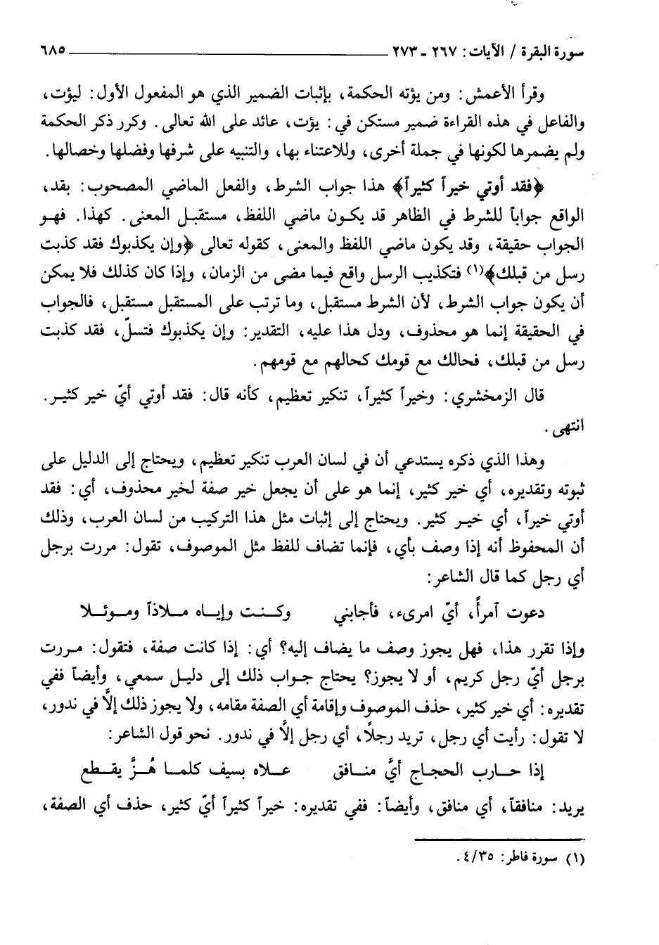 فَقَدْ أُوتِيَ خَيْراً كَثِيراً هَذَا جَوَابُ الشَّرْطِ، وَالْفِعْلُ الْمَاضِي الْمَصْحُوبُ: بِقَدْ، الْوَاقِعُ جَوَابًا لِلشَّرْطِ فِي الظَّاهِرِ قَدْ يَكُونُ مَاضِيَ اللَّفْظِ، مُسْتَقْبَلَ الْمَعْنَى. كَهَذَا. فَهُوَ الْجَوَابُ حَقِيقَةً، وَقَدْ يَكُونُ مَاضِيَ اللَّفْظِ وَالْمَعْنَى، كَقَوْلِهِ تَعَالَى وَإِنْ يُكَذِّبُوكَ فَقَدْ كُذِّبَتْ رُسُلٌ مِنْ قَبْلِكَ «1» فَتَكْذِيبُ الرُّسُلِ وَاقِعٌ فِيمَا مَضَى مِنَ الزَّمَانِ، وَإِذَا كَانَ كَذَلِكَ فَلَا يُمْكِنُ أَنْ يَكُونَ جَوَابُ الشَّرْطِ، لِأَنَّ الشَّرْطَ مُسْتَقْبَلٌ، وَمَا تَرَتَّبَ عَلَى الْمُسْتَقْبَلِ مُسْتَقْبَلٌ، فَالْجَوَابُ فِي الْحَقِيقَةِ إِنَّمَا هُوَ مَحْذُوفٌ، وَدَلَّ هَذَا عَلَيْهِ، التَّقْدِيرُ: وَإِنْ يُكَذِّبُوكَ فَتَسَلَّ، فَقَدْ كُذِّبَتْ رُسُلٌ مِنْ قَبْلِكَ، فَحَالُكَ مَعَ قَوْمِكَ كَحَالِهِمْ مَعَ قَوْمِهِمْ.
