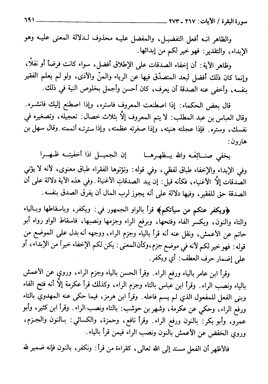 وَيُكَفِّرُ عَنْكُمْ مِنْ سَيِّئاتِكُمْ قَرَأَ بِالْوَاوِ الْجُمْهُورُ فِي: وَيُكَفِّرُ، وَبِإِسْقَاطِهَا وَبِالْيَاءِ وَالتَّاءِ وَالنُّونِ، وَبِكَسْرِ الْفَاءِ وَفَتْحِهَا، وَبِرَفْعِ الرَّاءِ وَجَزْمِهَا وَنَصْبِهَا، فَإِسْقَاطُ الْوَاوِ رَوَاهُ أَبُو حَاتِمٍ عَنِ الْأَعْمَشِ، وَنَقَلَ عَنْهُ أَنَّهُ قَرَأَ بِالْيَاءِ وَجَزْمِ الرَّاءِ، وَوَجْهُهُ أَنَّهُ بَدَلٌ عَلَى الْمَوْضِعِ مِنْ قَوْلِهِ: فَهُوَ خَيْرٌ لَكُمْ لأنه في موضع جَزْمٍ، وَكَأَنَّ الْمَعْنَى: يَكُنْ لَكُمُ الْإِخْفَاءُ خَيْرًا مِنَ الْإِبْدَاءِ، أَوْ عَلَى إِضْمَارِ حَرْفِ الْعَطْفِ: أَيْ وَيُكَفِّرُ.