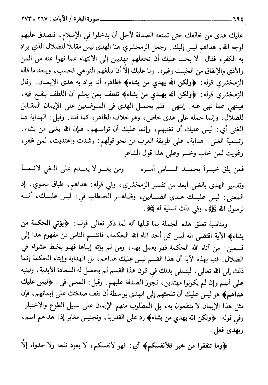 وَمُنَاسَبَةُ تَعَلُّقِ هَذِهِ الْجُمْلَةِ بِمَا قَبْلَهَا أَنَّهُ لَمَّا ذَكَرَ تَعَالَى قَوْلَهُ: يُؤْتِي الْحِكْمَةَ مَنْ يَشاءُ الْآيَةَ اقْتَضَى أَنْهُ لَيْسَ كُلُّ أَحَدٍ آتَاهُ اللَّهُ الْحِكْمَةَ، فَانْقَسَمَ النَّاسُ مِنْ مَفْهُومِ هَذَا إِلَى قِسْمَيْنِ: مَنْ آتَاهُ اللَّهُ الْحِكْمَةَ فَهُوَ يَعْمَلُ بِهَا، وَمَنْ لَمْ يُؤْتِهِ إِيَّاهَا فَهُوَ يَخْبِطُ عَشْوَاءً فِي الضَّلَالِ. فَنَبَّهَ بِهَذِهِ الْآيَةِ أَنَّ هَذَا الْقِسْمَ لَيْسَ عَلَيْكَ هُدَاهُمْ، بَلِ الْهِدَايَةُ وَإِيتَاءُ الْحِكْمَةِ إِنَّمَا ذَلِكَ إِلَى اللَّهِ تَعَالَى، لِيَتَسَلَّى بِذَلِكَ فِي كَوْنِ هَذَا الْقِسْمِ لَمْ يَحْصُلْ لَهُ السَّعَادَةُ الْأَبَدِيَّةُ، وَلِيُنَبِّهَ عَلَى أَنَّهُمْ وَإِنْ لَمْ يَكُونُوا مُهْتَدِينَ، تَجُوزُ الصَّدَقَةُ عَلَيْهِمْ. وَقِيلَ: الْمَعْنَى فِي: لَيْسَ عَلَيْكَ هُداهُمْ هُوَ لَيْسَ عَلَيْكَ أَنْ تُلْجِئَهُمْ إِلَى الْهُدَى بِوَاسِطَةِ أَنْ تَقِفَ صَدَقَتَكَ عَلَى إِيمَانِهِمْ، فَإِنَّ مِثْلَ هَذَا الْإِيمَانِ لَا يَنْتَفِعُونَ بِهِ، بَلِ الْمَطْلُوبُ مِنْهُمُ الْإِيمَانُ عَلَى سَبِيلِ الطَّوْعِ وَالِاخْتِيَارِ.