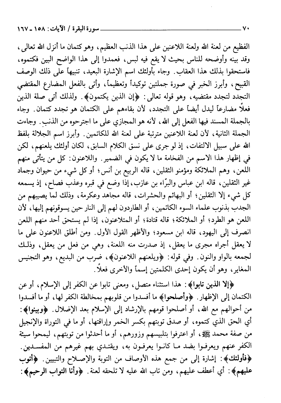 إِلَّا الَّذِينَ تابُوا: هَذَا اسْتِثْنَاءٌ مُتَّصِلٌ، وَمَعْنَى تَابُوا عَنِ الْكُفْرِ إِلَى الْإِسْلَامِ، أَوْ عَنِ الْكِتْمَانِ إِلَى الْإِظْهَارِ. وَأَصْلَحُوا مَا أَفْسَدُوا مِنْ قُلُوبِهِمْ بِمُخَالَطَةِ الْكُفْرِ لَهَا، أَوْ مَا أَفْسَدُوا مِنْ أَحْوَالِهِمْ مَعَ اللَّهِ، أَوْ أَصْلَحُوا قَوْمَهُمْ بِالْإِرْشَادِ إِلَى الْإِسْلَامِ بَعْدَ الْإِضْلَالِ. وَبَيَّنُوا: