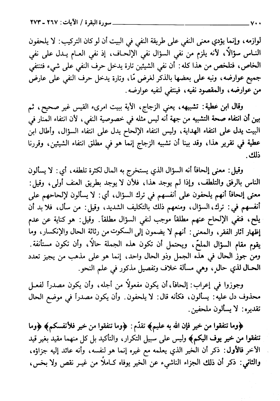 مَعْنَى إِلْحَافًا أَنَّهُمْ يُلْحِفُونَ عَلَى أَنْفُسِهِمْ فِي تَرْكِ السُّؤَالِ، أَيْ: لَا يَسْأَلُونَ لِإِلْحَاحِهِمْ عَلَى أَنْفُسِهِمْ في: ترك، السُّؤَالَ، وَمَنْعُهُمْ ذَلِكَ بِالتَّكْلِيفِ الشَّدِيدِ، وَقِيلَ: مَنْ سَأَلَ، فَلَا بُدَّ أَنْ يُلِحَّ، فَنَفْيُ الْإِلْحَاحِ عَنْهُمْ مُطْلَقًا مُوجِبٌ لِنَفْيِ السُّؤَالِ مُطْلَقًا. وَقِيلَ: هُوَ كِنَايَةٌ عَنِ عَدَمِ إِظْهَارِ آثَارِ الْفَقْرِ، وَالْمَعْنَى: أَنَّهُمْ لَا يَضُمُّونَ إلى السكوت مِنْ رَثَاثَةِ الْحَالِ وَالِانْكِسَارِ، وَمَا يَقُومُ مَقَامَ السُّؤَالِ الْمُلِحِّ، وَيُحْتَمَلُ أَنْ تَكُونَ هَذِهِ الْجُمْلَةُ حَالًا، وَأَنْ تَكُونَ مُسْتَأْنَفَةً.