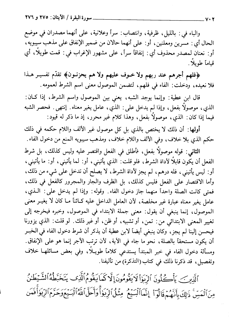 الثَّانِي: قَوْلُهُ مَوْصُولًا بِفِعْلٍ، فَأَطْلَقَ فِي الْفِعْلِ وَاقْتَصَرَ عَلَيْهِ وَلَيْسَ كَذَلِكَ، بَلْ شَرْطُ الْفِعْلِ أَنْ يَكُونَ قَابِلًا لِأَدَاةِ الشَّرْطِ، فَلَوْ قُلْتَ: الَّذِي يَأْتِينِي، أَوْ: لَمَّا يَأْتِينِي، أَوْ: مَا يَأْتِينِي، أَوْ: لَيْسَ يَأْتِينِي، فَلَهُ دِرْهَمٌ، لَمْ يَجُزْ لِأَدَاةِ الشَّرْطِ، لَا يُصْلِحُ أَنْ تَدْخُلَ عَلَى شَيْءٍ مِنْ ذَلِكَ، وَأَمَّا الِاقْتِصَارُ عَلَى الْفِعْلِ فَلَيْسَ كَذَلِكَ، بَلِ الظَّرْفُ وَالْجَارُّ وَالْمَجْرُورُ كَالْفِعْلِ فِي ذَلِكَ، فَمَتَى كَانَتِ الصِّلَةُ وَاحِدًا مِنْهُمَا جَازَ دُخُولُ الْفَاءِ. وَقَوْلُهُ: وَإِذَا لَمْ يَدْخُلْ عَلَى: الَّذِي، عَامِلٌ يغير معناه عِبَارَةً غَيْرَ مُخَلِّصَةٍ، لِأَنَّ الْعَامِلَ الدَّاخِلَ عَلَيْهِ كَائِنًا مَا كَانَ لَا يُغَيِّرُ مَعْنَى الْمَوْصُولِ، إِنَّمَا يَنْبَغِي أَنْ يَقُولَ: مَعْنَى جُمْلَةِ الِابْتِدَاءِ فِي الْمَوْصُولِ، وَخَبَرُهُ فَيُخْرِجُهُ إِلَى تَغْيِيرِ الْمَعْنَى الِابْتِدَائِيِّ مِنْ: تَمَنٍّ، أَوْ تَشْبِيهٍ، أَوْ ظَنٍّ، أَوْ غَيْرِ ذَلِكَ. لَوْ قُلْتَ: الَّذِي يَزُورُنَا فَيُحْسِنُ إِلَيْنَا لَمْ يَجُزْ، وَكَانَ يَنْبَغِي أَيْضًا لِابْنِ عَطِيَّةَ أَنْ يَذْكُرَ أَنَّ شَرْطَ دُخُولِ الْفَاءِ فِي الْخَبَرِ أَنْ يَكُونَ مُسْتَحَقًّا بِالصِّلَةِ، نَحْوَ مَا جَاءَ فِي الْآيَةِ، لِأَنَّ تَرَتُّبَ الْأَجْرِ إِنَّمَا هُوَ عَلَى الْإِنْفَاقِ.
