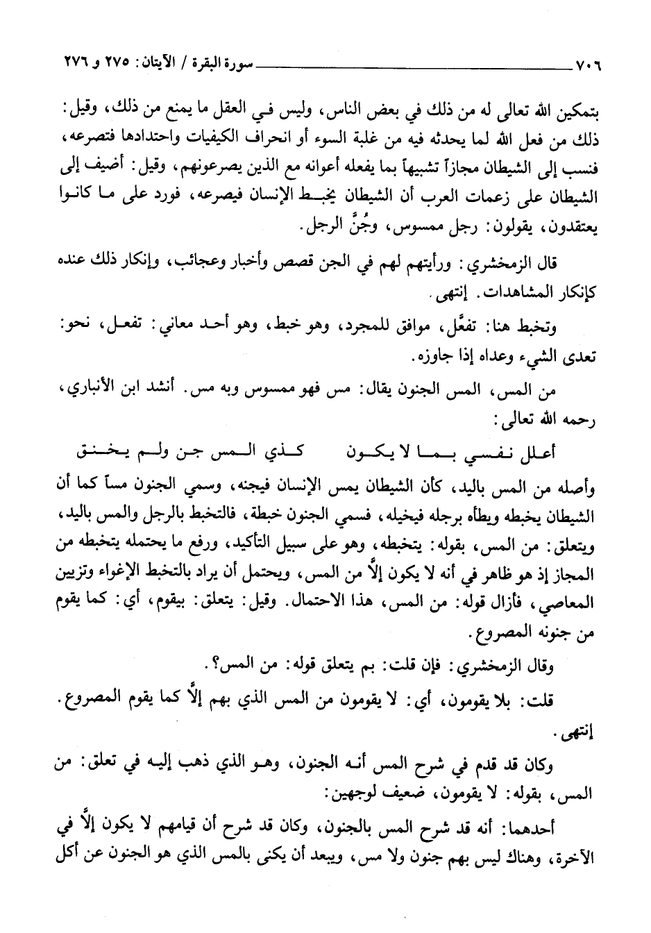 أَحَدُهُمَا: أَنَّهُ قَدْ شَرَحَ الْمَسَّ بِالْجُنُونِ، وَكَانَ قَدْ شَرَحَ أَنَّ قِيَامَهُمْ لَا يَكُونُ إِلَّا فِي الْآخِرَةِ، وَهُنَاكَ لَيْسَ بِهِمْ جُنُونٌ وَلَا مَسٌّ، وَيَبْعُدُ أَنْ يُكَنَّى بِالْمَسِّ الَّذِي هُوَ الْجُنُونُ عَنْ أَكْلِ