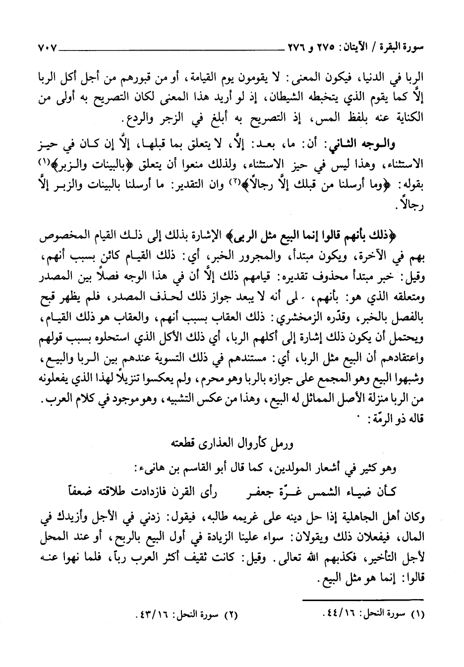 وَكَانَ أَهْلُ الْجَاهِلِيَّةِ إِذَا حَلَّ دَيْنُهُ عَلَى غَرِيمِهِ طَالَبَهُ، فَيَقُولُ: زِدْنِي فِي الْأَجَلِ وَأَزِيدُكَ فِي الْمَالِ، فَيَفْعَلَانِ ذَلِكَ وَيَقُولَانِ: سَوَاءٌ عَلَيْنَا الزِّيَادَةُ فِي أَوَّلِ الْبَيْعِ بِالرِّبْحِ، أَوْ عِنْدَ الْمَحَلِّ لِأَجْلِ التَّأْخِيرِ، فَكَذَّبَهُمُ اللَّهُ تَعَالَى. وَقِيلَ: كَانَتْ ثَقِيفُ أَكْثَرَ الْعَرَبِ رِبًا، فَلَمَّا نُهُوا عَنْهُ قَالُوا: إِنَّمَا هُوَ مثل البيع.