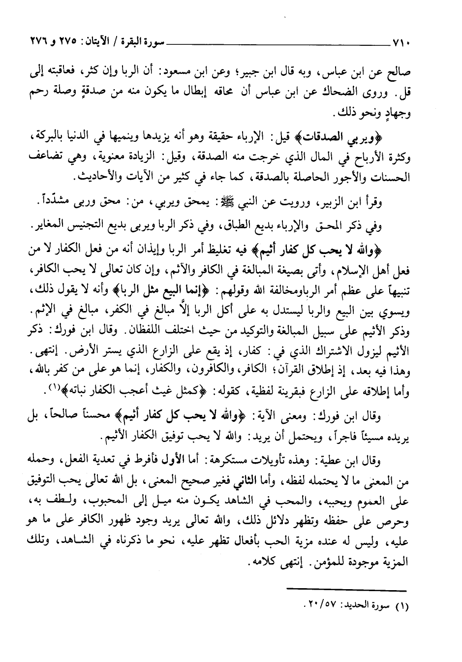 وَاللَّهُ لَا يُحِبُّ كُلَّ كَفَّارٍ أَثِيمٍ فِيهِ تَغْلِيظُ أَمْرِ الرِّبَا وَإِيذَانٌ أَنَّهُ مِنْ فِعْلِ الْكُفَّارِ لَا مِنْ فِعْلِ أَهْلِ الْإِسْلَامِ، وَأَتَى بِصِيغَةِ الْمُبَالَغَةِ فِي الْكَافِرِ وَالْآثِمِ، وَإِنْ كَانَ تَعَالَى لَا يُحِبُّ الْكَافِرَ، تَنْبِيهًا عَلَى عِظَمِ أَمْرِ الرِّبَا وَمُخَالَفَةِ اللَّهِ وَقَوْلِهِمْ: إِنَّمَا الْبَيْعُ مِثْلُ الرِّبا وَأَنَّهُ لَا يَقُولُ ذَلِكَ، وَيُسَوِّي بَيْنَ الْبَيْعِ وَالرِّبَا لِيَسْتَدِلَّ بِهِ عَلَى أَكْلِ الرِّبَا إِلَّا مُبَالِغٌ فِي الْكُفْرِ، مَبَالِغٌ فِي الْإِثْمِ.