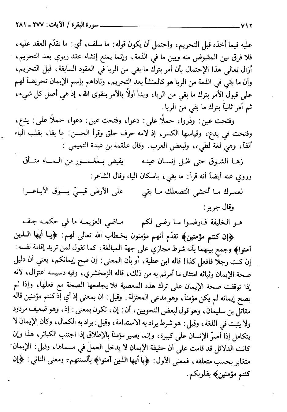 عَلَيْهِ فِيمَا أَخَذَهُ قَبْلَ التَّحْرِيمِ، وَاحْتَمَلَ أَنْ يَكُونَ قَوْلَهُ: مَا سَلَفَ، أَيْ: مَا تَقَدَّمَ الْعَقْدُ عَلَيْهِ، فَلَا فَرْقَ بَيْنَ الْمَقْبُوضِ مِنْهُ وَبَيْنَ مَا فِي الذِّمَّةِ، وَإِنَّمَا يَمْنَعُ إِنْشَاءَ عَقْدٍ رِبَوِيٍّ بَعْدَ التَّحْرِيمِ، أَزَالَ تَعَالَى هَذَا الْاحْتِمَالَ بِأَنْ أَمَرَ بِتَرْكِ مَا بَقِيَ مِنَ الرِّبَا فِي الْعُقُودِ السَّابِقَةِ، قَبْلَ التَّحْرِيمِ، وَأَنَّ مَا بَقِيَ فِي الذِّمَّةِ مِنَ الرِّبَا هُوَ كَالْمُنْشَأِ بَعْدَ التَّحْرِيمِ، وَنَادَاهُمْ بِاسْمِ الْإِيمَانِ تَحْرِيضًا لَهُمْ عَلَى قَبُولِ الْأَمْرِ بِتَرْكِ مَا بَقِيَ مِنَ الرِّبَا، وَبَدَأَ أَوَّلًا بِالْأَمْرِ بِتَقْوَى اللَّهِ، إِذْ هِيَ أَصْلُ كُلِّ شَيْءٍ، ثُمَّ أَمَرَ ثَانِيًا بِتَرْكِ مَا بَقِيَ مِنَ الرِّبَا.