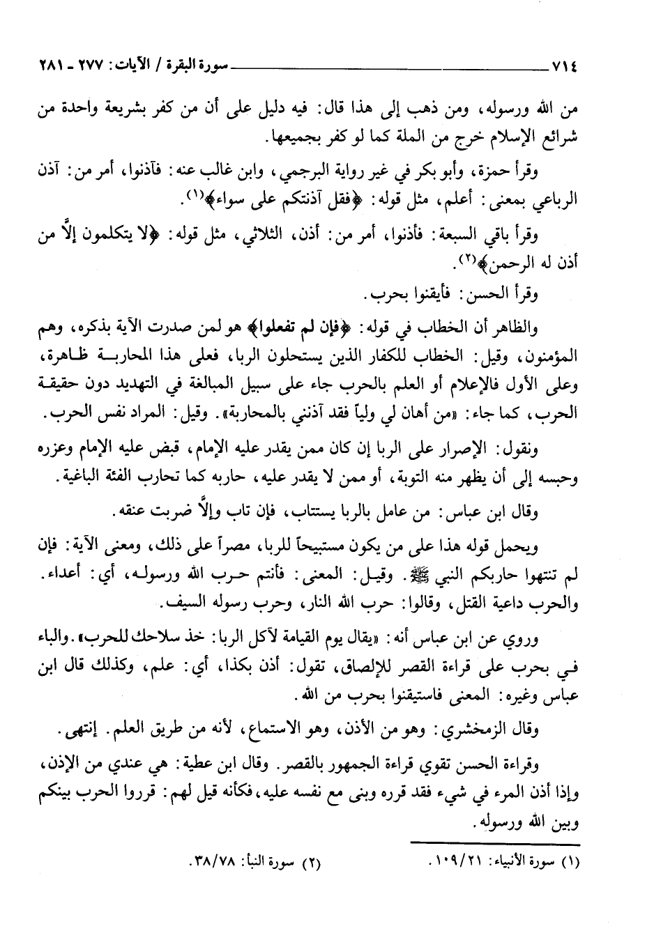 وَرُوِيَ عَنِ ابْنِ عَبَّاسٍ أَنَّهُ: «يُقَالُ يَوْمَ الْقِيَامَةِ لِآكِلِ الرِّبَا: خُذْ سِلَاحَكَ لِلْحَرْبِ» . وَالْبَاءُ فِي بِحَرْبٍ عَلَى قِرَاءَةِ الْقَصْرِ لِلْإِلْصَاقِ، تَقُولُ: أَذِنَ بِكَذَا، أَيْ: عَلِمَ، وَكَذَلِكَ قَالَ ابْنُ عَبَّاسٍ وَغَيْرُهُ: الْمَعْنَى فَاسْتَيْقِنُوا بِحَرْبٍ مِنَ اللَّهِ.