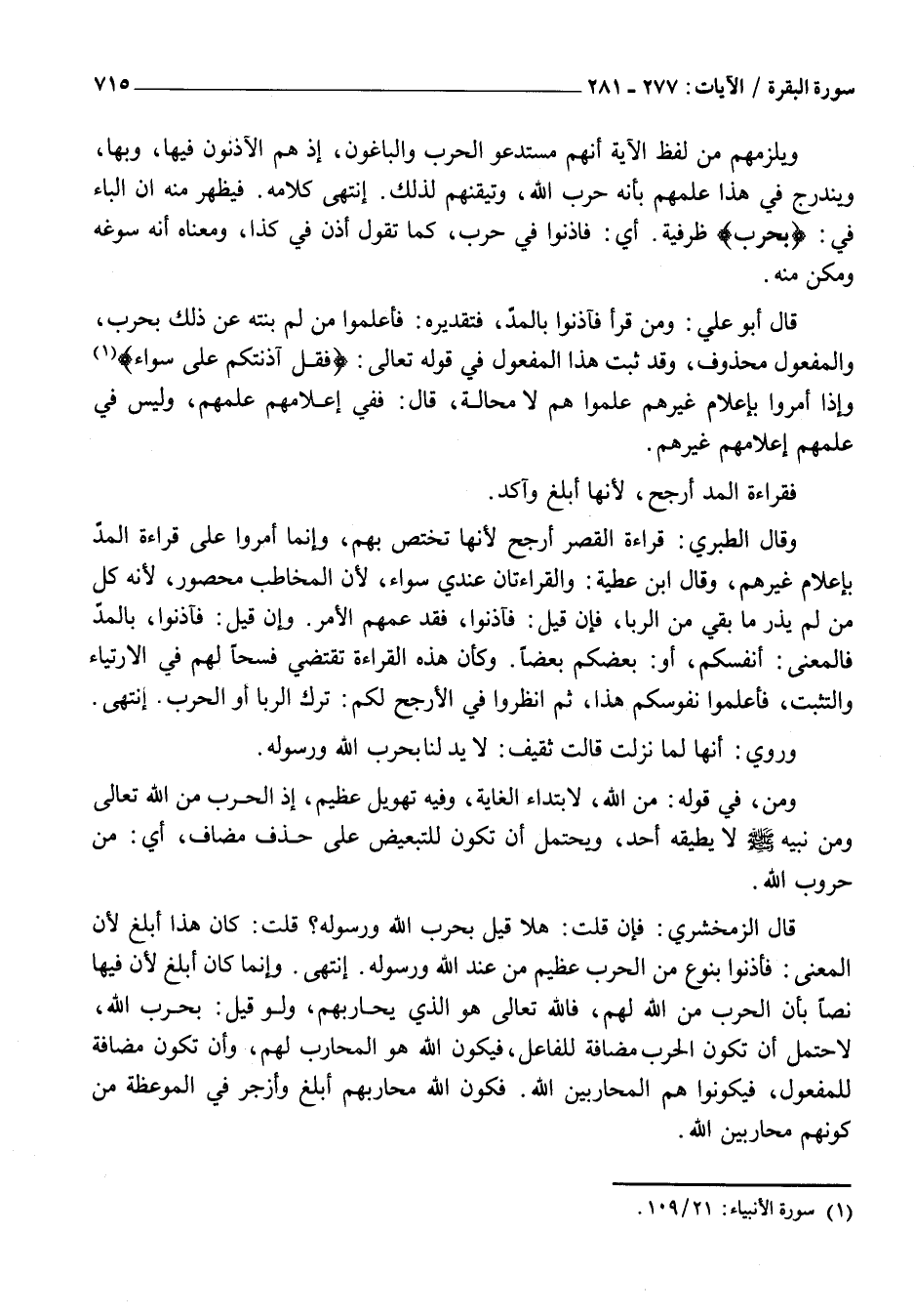 وَقَالَ الطَّبَرِيُّ: قِرَاءَةُ الْقَصْرِ أَرْجَحُ لِأَنَّهَا تَخْتَصُّ بِهِمْ، وَإِنَّمَا أُمِرُوا عَلَى قِرَاءَةِ الْمَدِّ بِإِعْلَامِ غَيْرِهِمْ، وَقَالَ ابْنُ عَطِيَّةَ: وَالْقِرَاءَتَانِ عِنْدِي سَوَاءٌ، لِأَنَّ الْمُخَاطَبَ مَحْصُورٌ، لِأَنَّهُ كُلُّ مَنْ لَمْ يَذَرْ مَا بَقِيَ مِنَ الرِّبَا، فَإِنْ قِيلَ: فَأْذَنُوا، فَقَدْ عَمَّهُمُ الْأَمْرُ. وَإِنْ قِيلَ: فَآذِنُوا، بِالْمَدِّ فَالْمَعْنَى: أَنْفُسَكُمْ، أَوْ: بَعْضَكُمْ بَعْضًا. وَكَأَنَّ هَذِهِ الْقِرَاءَةَ تَقْتَضِي فَسَحًا لَهُمْ فِي الِارْتِيَاءِ وَالتَّثَبُّتِ، فَأَعْلِمُوا نُفُوسَكُمْ هَذَا، ثُمَّ انْظُرُوا فِي الْأَرْجَحِ لَكُمْ: تَرْكِ الرِّبَا أَوِ الْحَرْبِ. انْتَهَى.