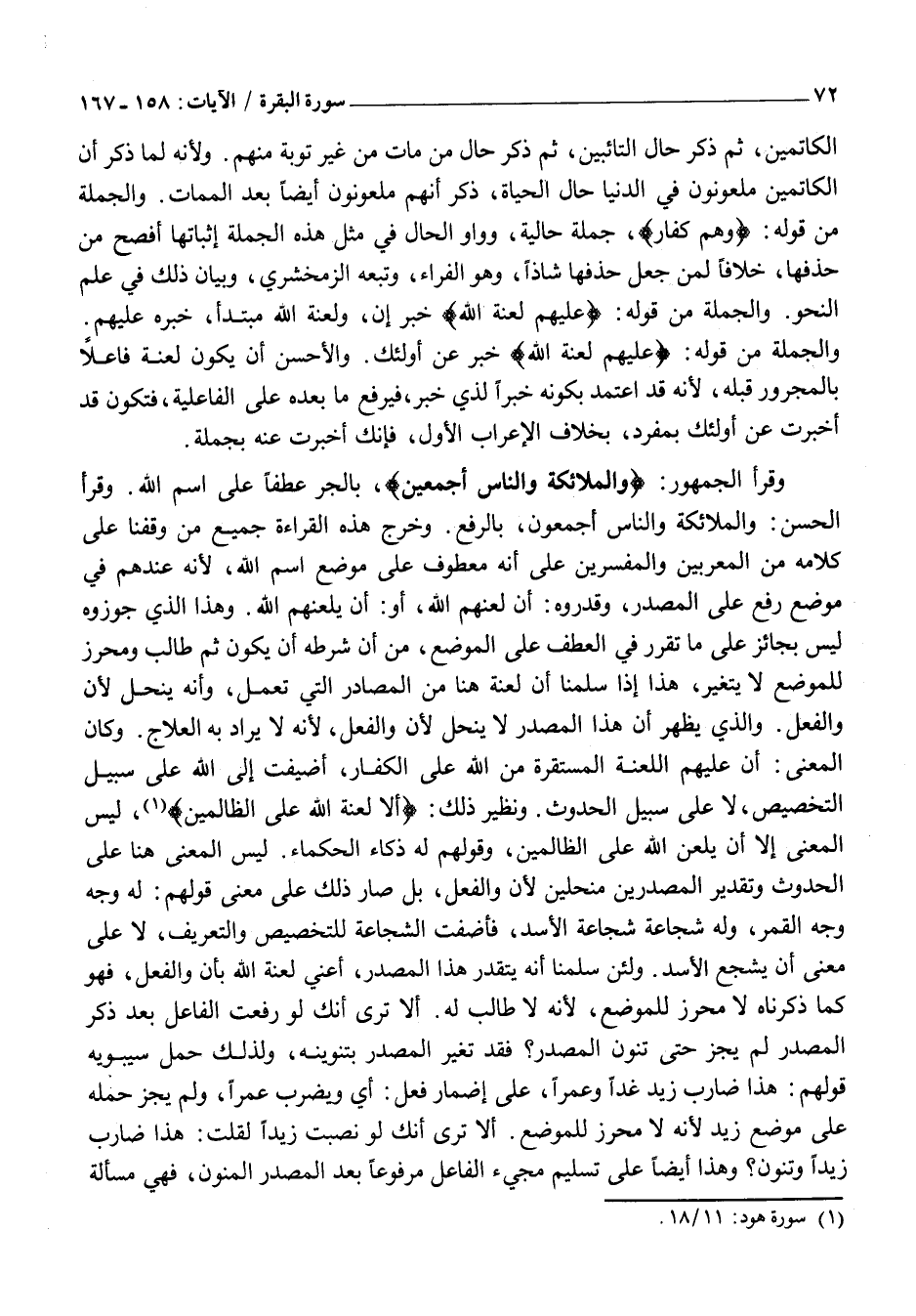 الْكَاتِمِينَ، ثُمَّ ذَكَرَ حَالَ التَّائِبِينَ، ثُمَّ ذَكَرَ حَالَ مَنْ مَاتَ مِنْ غَيْرِ تَوْبَةٍ مِنْهُمْ. وَلِأَنَّهُ لَمَّا ذَكَرَ أَنَّ الْكَاتِمِينَ مَلْعُونُونَ فِي الدُّنْيَا حَالَ الْحَيَاةِ، ذَكَرَ أَنَّهُمْ مَلْعُونُونَ أَيْضًا بَعْدَ الْمَمَاتِ. وَالْجُمْلَةُ مِنْ قَوْلِهِ: وَهُمْ كُفَّارٌ، جُمْلَةٌ حَالِيَّةٌ، وَوَاوُ الْحَالِ فِي مِثْلِ هَذِهِ الْجُمْلَةِ إِثْبَاتُهَا أَفْصَحُ مِنْ حَذْفِهَا، خِلَافًا لِمَنْ جَعَلَ حَذْفَهَا شَاذًّا، وَهُوَ الْفَرَّاءُ، وَتَبِعَهُ الزَّمَخْشَرِيُّ، وَبَيَانُ ذَلِكَ فِي عِلْمِ النَّحْوِ. وَالْجُمْلَةُ مِنْ قَوْلِهِ: عَلَيْهِمْ لَعْنَةُ اللَّهِ خبر إِنَّ، وَلَعْنَةُ اللَّهِ مُبْتَدَأٌ، خَبَرُهُ عَلَيْهِمْ.
