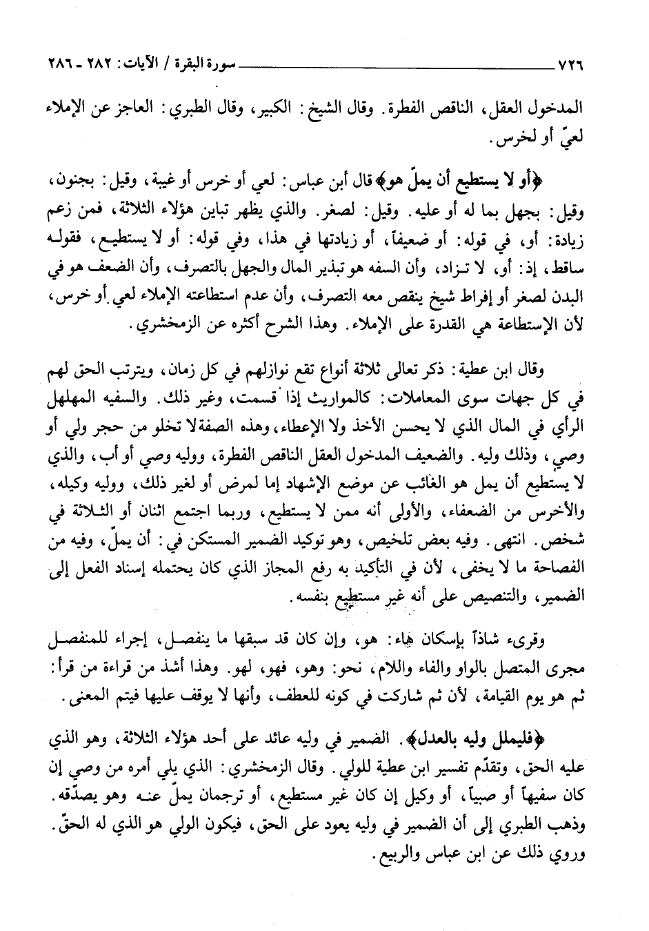 أَوْ لا يَسْتَطِيعُ أَنْ يُمِلَّ هُوَ قَالَ ابْنُ عَبَّاسٍ: لِعَيٍّ أَوْ خَرَسٍ أَوْ غَيْبَةٍ، وَقِيلَ: بِجُنُونٍ، وَقِيلَ: بِجَهْلٍ بِمَا لَهُ أَوْ عَلَيْهِ. وَقِيلَ: لِصِغَرٍ. وَالَّذِي يَظْهَرُ تَبَايُنُ هَؤُلَاءِ الثَّلَاثَةِ، فَمَنْ زَعَمَ زِيَادَةَ: أَوْ، فِي قَوْلِهِ: أَوْ ضَعِيفًا، أَوْ زِيَادَتَهَا فِي هَذَا، وَفِي قَوْلِهِ: أَوْ لَا يَسْتَطِيعُ، فَقَوْلُهُ سَاقِطٌ، إِذْ: أَوْ، لَا تُزَادُ، وَأَنَّ السَّفَهَ هُوَ تَبْذِيرُ الْمَالِ وَالْجَهْلُ بِالتَّصَرُّفِ، وَأَنَّ الضَّعْفَ هُوَ فِي الْبَدَنِ لِصِغَرٍ أَوْ إِفْرَاطِ شَيْخٍ يَنْقُصُ مَعَهُ التَّصَرُّفُ، وَأَنَّ عَدَمَ اسْتِطَاعَتِهِ الْإِمْلَاءَ لِعَيٍّ. أَوْ خَرَسٍ، لِأَنَّ الِاسْتِطَاعَةَ هِيَ القدرة على الإملاء. وَهَذَا الشَّرْحُ أَكْثَرُهُ عَنِ الزَّمَخْشَرِيُّ.
