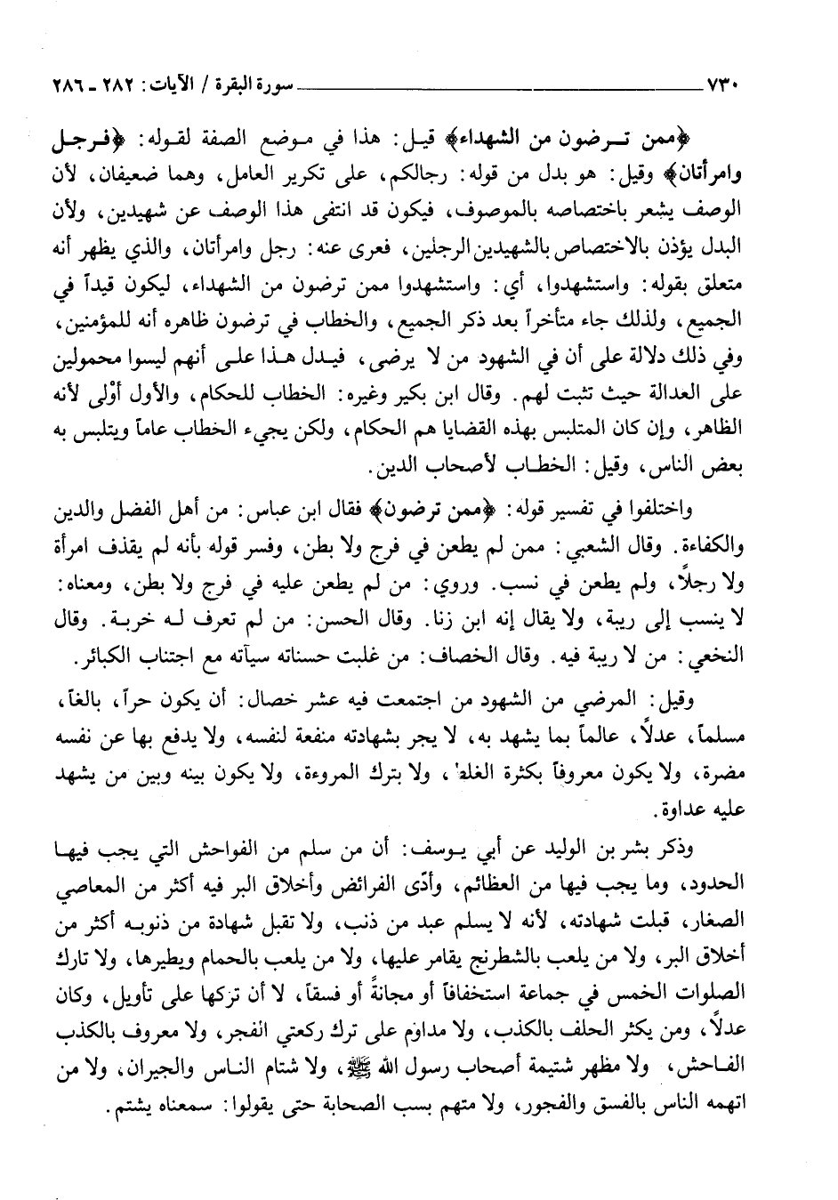 وَاخْتَلَفُوا فِي تَفْسِيرِ قَوْلِهِ: مِمَّنْ تَرْضَوْنَ فَقَالَ ابْنُ عَبَّاسٍ: مِنْ أَهْلِ الْفَضْلِ وَالدِّينِ وَالْكَفَاءَةِ. وَقَالَ الشَّعْبِيُّ: مِمَّنْ لَمْ يَطْعَنْ فِي فَرْجٍ وَلَا بَطْنٍ، وَفَسَّرَ قَوْلُهُ بِأَنَّهُ لَمْ يَقْذِفِ امْرَأَةً وَلَا رَجُلًا، وَلَمْ يَطْعَنْ فِي نَسَبٍ. وَرُوِيَ: مَنْ لَمْ يُطْعَنْ عَلَيْهِ فِي فَرْجٍ وَلَا بَطْنٍ، وَمَعْنَاهُ: