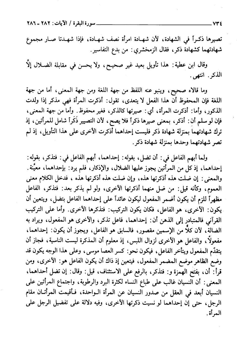 وَالْمَعْنَى: إِنْ ضَلَّتْ هَذِهِ أَذْكَرَتْهَا هَذِهِ، وَإِنْ ضَلَّتْ هَذِهِ أَذْكَرَتْهَا هَذِهِ، فَدَخَلَ الْكَلَامُ مَعْنَى الْعُمُومِ، وَكَأَنَّهُ قِيلَ: مَنْ ضَلَّ مِنْهُمَا أَذَكَرَتْهَا الْأُخْرَى، وَلَوْ لَمْ يَذْكُرْ بَعْدَ: فَتُذَكِّرَ، الْفَاعِلَ مُظْهَرًا لَلَزِمَ أَنْ يَكُونَ أَضْمَرَ الْمَفْعُولَ لِيُكُونَ عَائِدًا عَلَى إِحْدَاهُمَا الْفَاعِلِ بتضل، وَيَتَعَيَّنُ أَنْ يَكُونَ: الْأُخْرَى، هُوَ الْفَاعِلُ، فَكَانَ يَكُونُ التَّرْكِيبُ: فَتُذَكِّرَهَا الْأُخْرَى. وَأَمَّا عَلَى التَّرْكِيبِ الْقُرْآنِيِّ فَالْمُتَبَادِرُ إِلَى الذِّهْنِ أَنَّ: إِحْدَاهُمَا، فاعل تذكر، والأخرى هُوَ الْمَفْعُولُ، وَيُرَادُ بِهِ الضَّالَّةُ، لِأَنَّ كُلًّا مِنَ الِاسْمَيْنِ مَقْصُورٌ، فَالسَّابِقُ هُوَ الْفَاعِلُ، وَيَجُوزُ أَنْ يَكُونَ: إِحْدَاهُمَا، مَفْعُولًا، وَالْفَاعِلُ هُوَ الْأُخْرَى لِزَوَالِ اللَّبْسِ، إِذْ مَعْلُومٌ أَنَّ الْمُذَكِّرَةَ لَيْسَتِ النَّاسِيَةَ، فَجَازَ أَنْ يَتَقَدَّمَ الْمَفْعُولُ وَيَتَأَخَّرَ الْفَاعِلُ، فَيَكُونُ نَحْوُ: كَسَرَ الْعَصَا مُوسَى، وَعَلَى هَذَا الْوَجْهِ يَكُونُ قَدْ وُضِعَ الظَّاهِرُ مَوْضِعَ الْمُضْمَرِ الْمَفْعُولِ، فَيَتَعَيَّنُ إِذْ ذَاكَ أَنْ يَكُونَ الْفَاعِلُ هُوَ: الْأُخْرَى، وَمَنْ قَرَأَ: أَنْ، بِفَتْحِ الْهَمْزَةِ وَ: فَتُذَكِرُ، بِالرَّفْعِ عَلَى الِاسْتِئْنَافِ، قِيلَ: وَقَالَ: أَنْ تَضِلَّ إِحْدَاهُمَا، الْمَعْنَى: أَنَّ النِّسْيَانَ غَالِبٌ عَلَى طِبَاعِ النِّسَاءِ لِكَثْرَةِ الْبَرْدِ وَالرُّطُوبَةِ، وَاجْتِمَاعُ الْمَرْأَتَيْنِ عَلَى النِّسْيَانِ أَبْعَدُ فِي الْعَقْلِ مِنْ صُدُورِ النِّسْيَانِ عَنِ الْمَرْأَةِ الْوَاحِدَةِ، فَأُقِيمَتِ الْمَرْأَتَانِ مَقَامَ الرَّجُلِ، حَتَّى إِنَّ إِحْدَاهُمَا لَوْ نَسِيَتْ ذَكَّرَتْهَا الْأُخْرَى، وَفِيهِ دَلَالَةٌ عَلَى تَفْضِيلِ الرَّجُلِ عَلَى الْمَرْأَةِ.