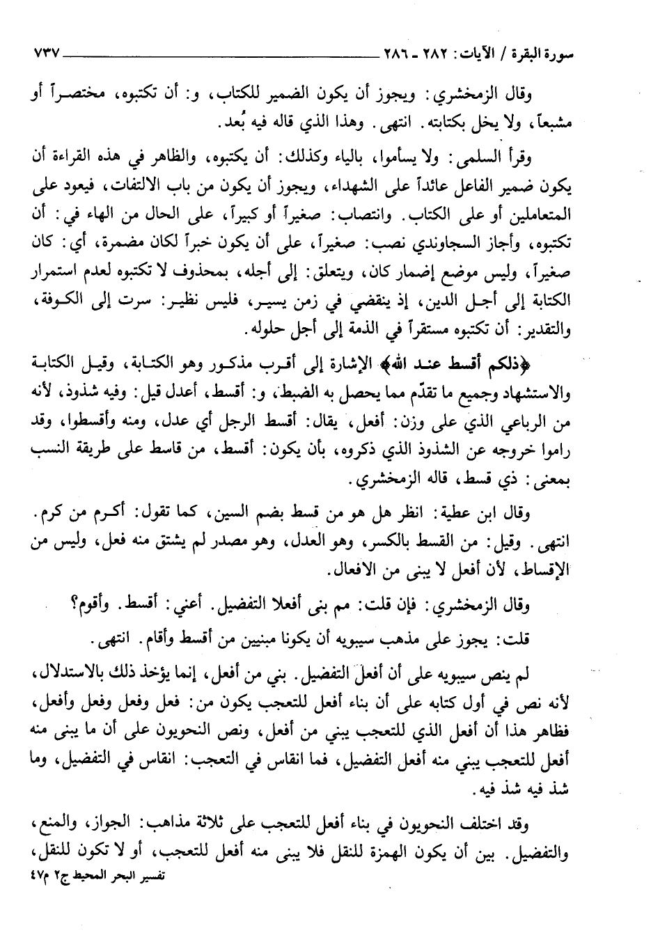 وَقَالَ الزَّمَخْشَرِيُّ: وَيَجُوزُ أَنْ يَكُونَ الضَّمِيرُ لِلْكِتَابِ، وَ: أَنْ تَكْتُبُوهُ، مُخْتَصَرًا أَوْ مُشَبَّعًا، وَلَا يُخَلُّ بِكِتَابَتِهِ. انْتَهَى. وَهَذَا الَّذِي قَالَهُ فِيهِ بُعْدٌ.