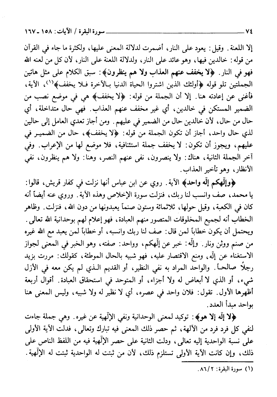 وَيُحْتَمَلُ أَنْ يَكُونَ خِطَابًا لِمَنْ قَالَ: صِفْ لَنَا رَبَّكَ وَانْسِبْهُ، أَوْ خِطَابًا لِمَنْ يَعْبُدُ مَعَ اللَّهِ غَيْرَهُ مِنْ صَنَمٍ وَوَثَنٍ وَنَارٍ. وَإِلَهٌ: خَبَرٌ عَنْ إِلَهِكُمْ، وَوَاحِدٌ: صِفَتُهُ، وَهُوَ الْخَبَرُ فِي الْمَعْنَى لِجَوَازِ الِاسْتِغْنَاءِ عَنْ إِلَهٍ، وَمَنْعِ الِاقْتِصَارِ عَلَيْهِ، فَهُوَ شَبِيهٌ بِالْحَالِ الْمُوَطِّئَةِ، كَقَوْلِكَ: مَرَرْتُ بِزَيْدٍ رَجُلًا صَالِحًا. وَالْوَاحِدُ الْمُرَادُ بِهِ نَفْيُ النَّظِيرِ، أَوِ الْقَدِيمِ الَّذِي لَمْ يَكُنْ مَعَهُ فِي الْأَزَلِ شَيْءٌ، أَوِ الَّذِي لَا أَبْعَاضَ لَهُ وَلَا أَجْزَاءَ، أَوِ الْمُتَوَحِّدُ فِي اسْتِحْقَاقِ الْعِبَادَةِ. أَقْوَالٌ أَرْبَعَةٌ أَظْهَرُهَا الْأَوَّلُ. تَقُولُ: فُلَانٌ وَاحِدٌ فِي عَصْرِهِ، أَيْ لَا نَظِيرَ لَهُ وَلَا شَبِيهَ، وَلَيْسَ الْمَعْنَى هُنَا بِوَاحِدٍ مَبْدَأَ الْعَدَدِ.